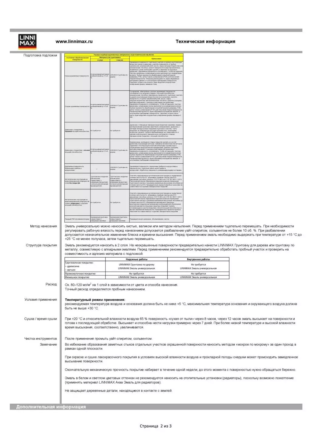 Температурный режим применения: рекомендуемая температура воздуха и основания должна быть не ниже +5°C. Максимальная температура основания и окружающего воздуха должна быть не выше +30°C. Может быть нанесена кистью, валиком или методом напыления. Перед использованием рекомендуется тщательно перемешать. Регулирование рабочей вязкости и разбавление уайт-спиритом или сольвентом (не более 10%) допускается. Эмаль рекомендуется наносить в 2 слоя. На неокрашенные поверхности предварительно нанести LINNIMAX Грунтовка для дерева или грунтовку по металлу, совместимую с алкидными эмалями. Перед применением рекомендуется предварительно обработать пробный участок и проверить на совместимость и адгезию материала с подложкой.