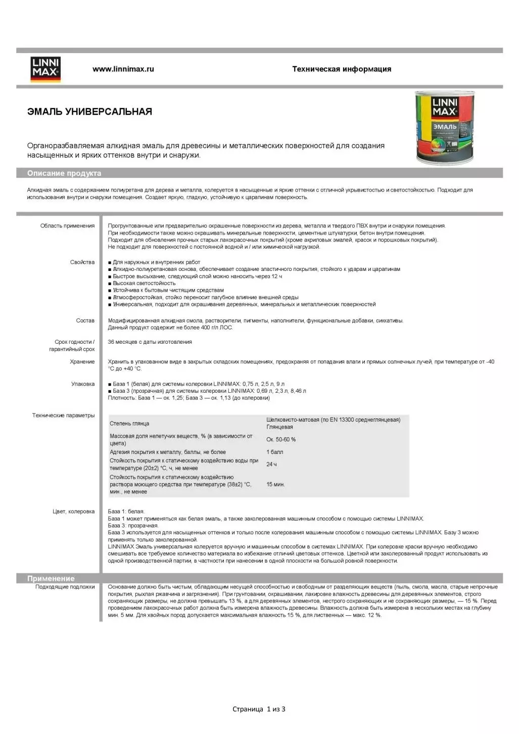 Может использоваться как белая эмаль или быть заколерованной машинным способом с использованием системы LINNIMAX. База 3: прозрачная. Используется для насыщенных оттенков, подлежит колеровке машинным способом с использованием системы LINNIMAX. Базу 3 можно применять только заколерованной.