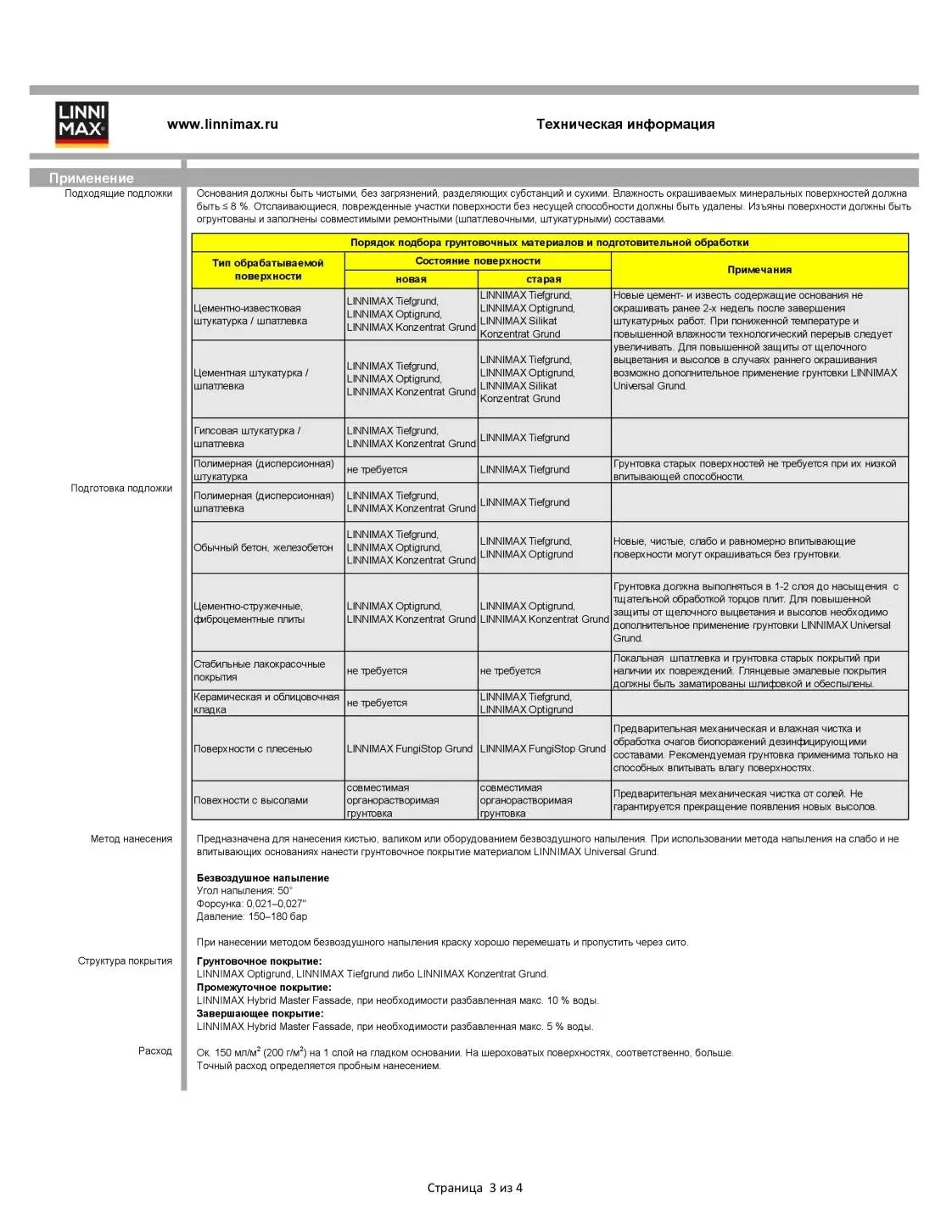 Предназначена для нанесения кистью, валиком или оборудованием безвоздушного напыления. При нанесении методом напыления на слабо и не впитывающих основаниях нанести грунтовочное покрытие материалом LINNIMAX Universal Grund.