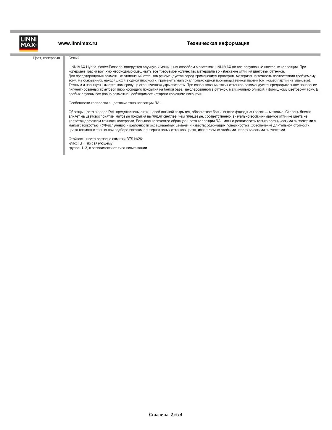 LINNIMAX Hybrid Master Fassade колеруется вручную и машинным способом в системах LINNIMAX во все популярные цветовые коллекции. При колеровке краски вручную необходимо смешивать все требуемое количество материала между собой во избежание отличий цветовых оттенков. Для предотвращения возможных отклонений оттенков рекомендуется перед применением проверять материал на точность соответствия требуемому тону. На основаниях находящихся в одной плоскости применять материал только одной производственной партии (см. номер партии на упаковке). Темным и насыщенным оттенкам присуща ограниченная укрывистость. При использовании таких оттенков рекомендуется предварительное нанесение пигментированных грунтовок либо кроющего покрытия на белой базе, заколерованной в максимально близкий оттенок к финишному цветовому тону. В особых случаях все равно возможна необходимость второго кроющего покрытия.
