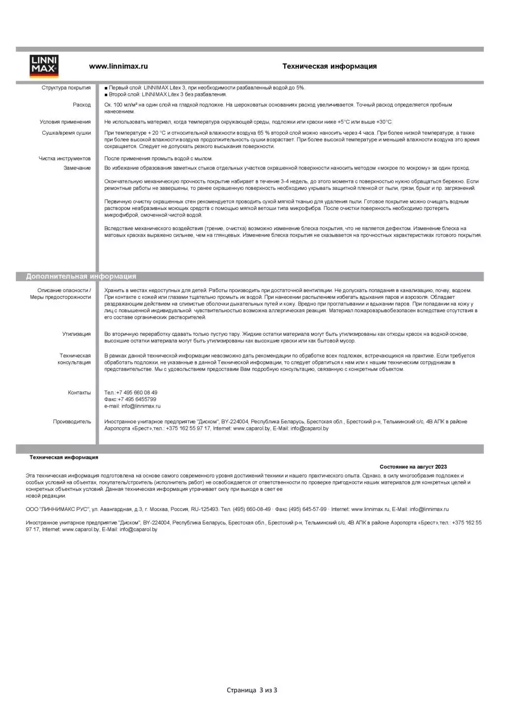 Продукт предназначен для компьютерной колеровки в системе LINNIMAX. Чтобы исключить возможную ошибку при колеровке, перед применением необходимо проверить точность цветового тона. На соприкасающиеся поверхности необходимо наносить материал из одной партии. Темным и насыщенным оттенкам присуща ограниченная укрывистость. При использовании таких оттенков рекомендуется предварительное нанесение пигментированных грунтовок либо кроющего покрытия на белой базе, заколерованной в максимально близкий оттенок к финишному цветовому тону. Чтобы получить покрытие с равномерным цветовым тоном, подложка должна обладать равномерной впитывающей способностью.