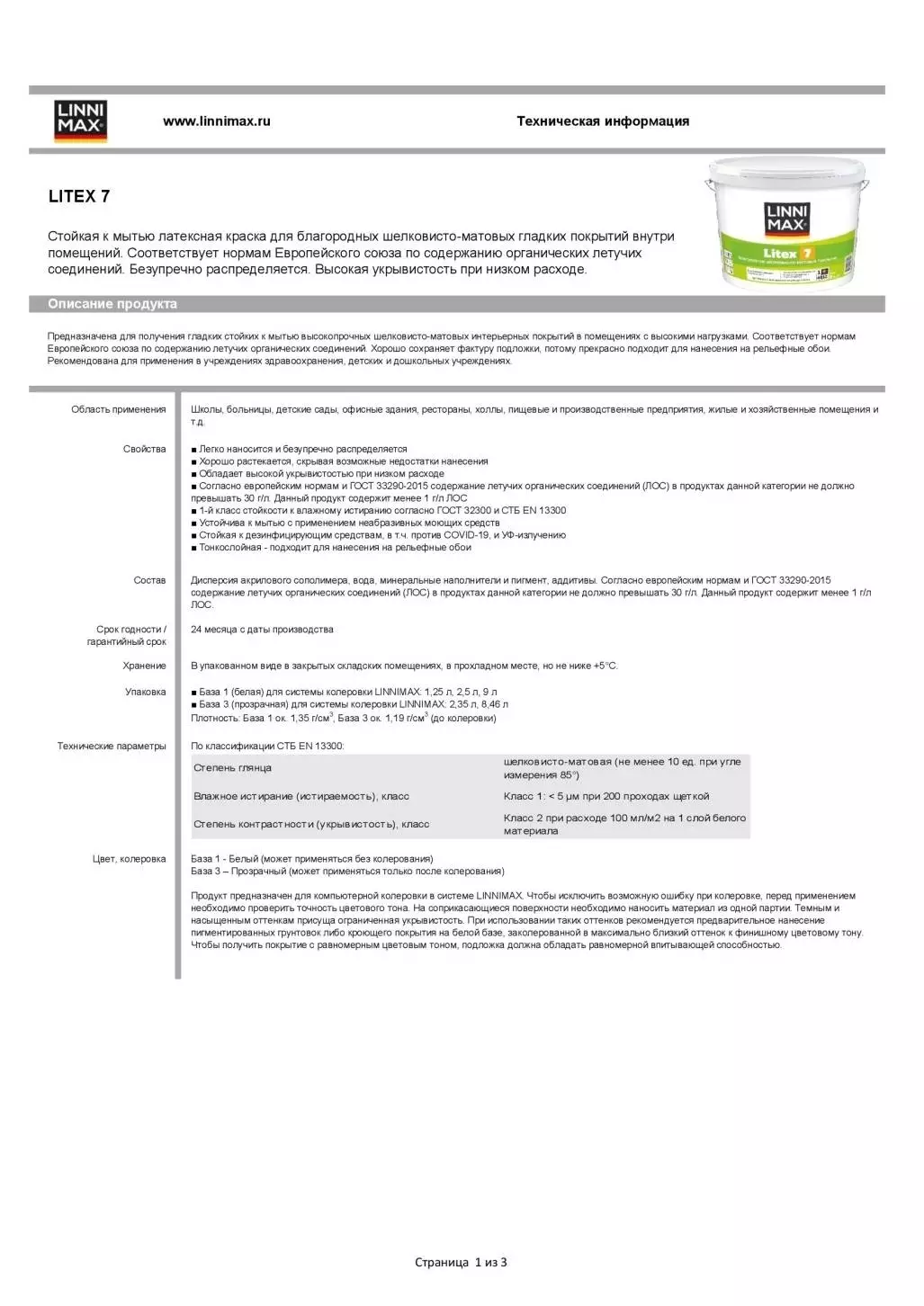 - Cогласно европейским нормам и ГОСТ 33290-2015 содержание летучих органических соединений (ЛОС) в продуктах данной категории не должно превышать 30 г/л. Данный продукт содержит менее 1 г/л ЛОС