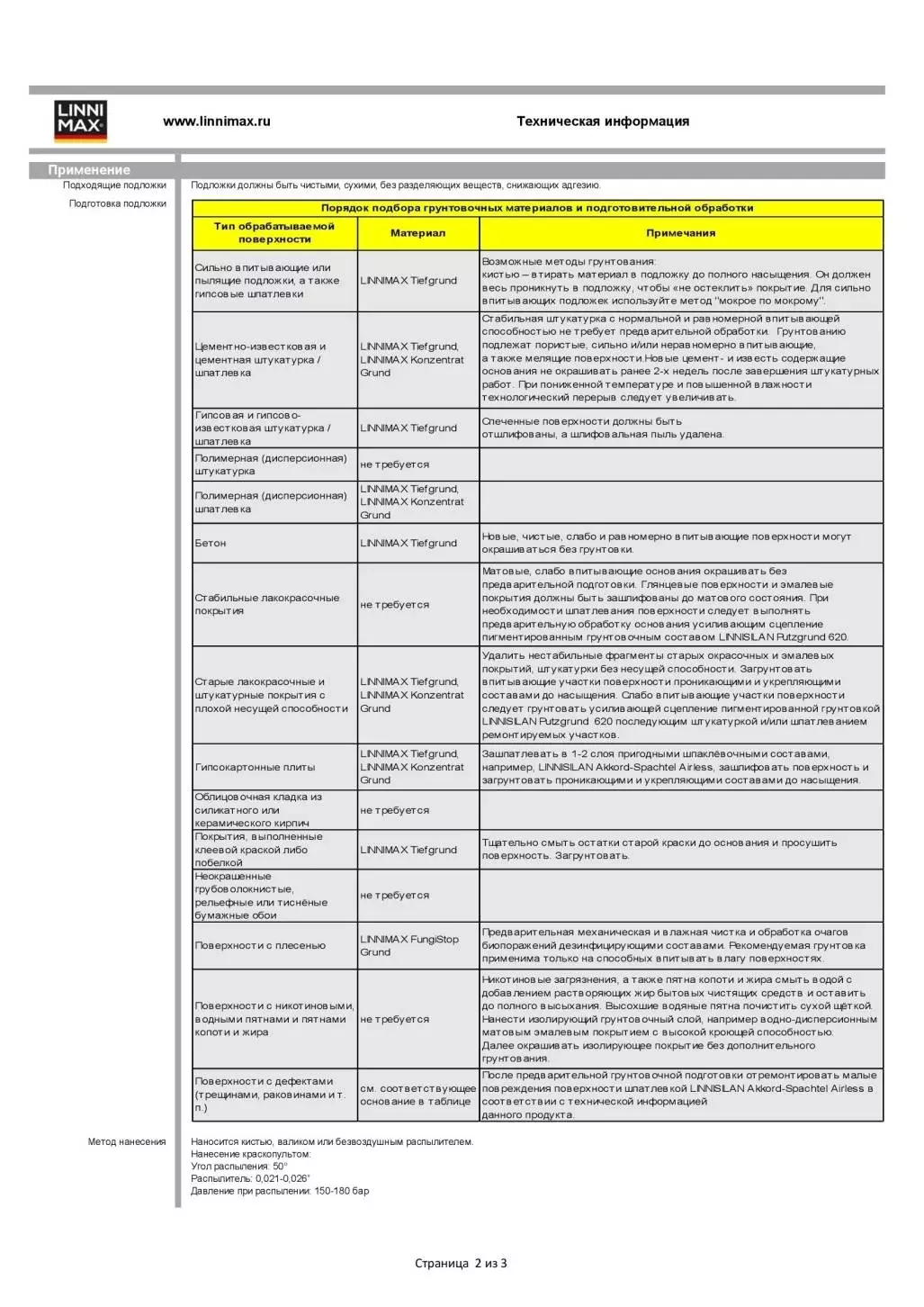Продукт предназначен для компьютерной колеровки в системе LINNIMAX. Чтобы исключить возможную ошибку при колеровке, перед применением необходимо проверить точность цветового тона. На соприкасающиеся поверхности необходимо наносить материал из одной партии. Темным и насыщенным оттенкам присуща ограниченная укрывистость. При использовании таких оттенков рекомендуется предварительное нанесение пигментированных грунтовок либо кроющего покрытия на белой базе, заколерованной в максимально близкий оттенок к финишному цветовому тону. Чтобы получить покрытие с равномерным цветовым тоном, подложка должна обладать равномерной впитывающей способностью.