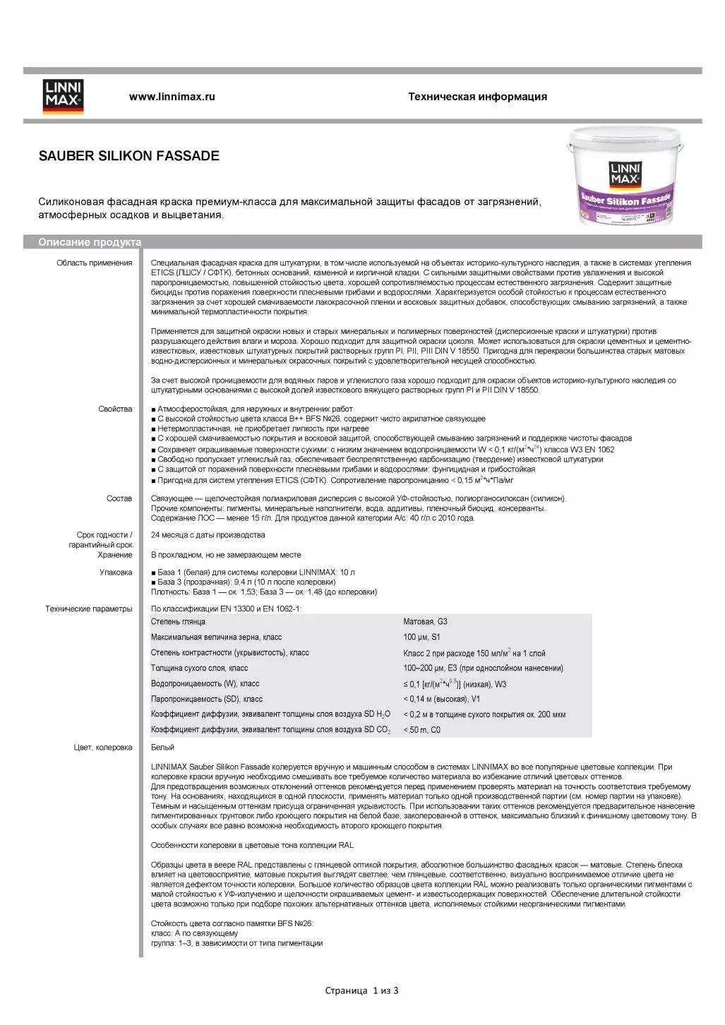 Специальная фасадная краска для штукатурки, в том числе используемой на объектах историко-культурного наследия, а также в системах утепления ETICS (ЛШСУ / СФТК), бетонных оснований, каменной и кирпичной кладки. С сильными защитными свойствами против увлажнения и высокой паропроницаемостью, повышенной стойкостью цвета, хорошей сопротивляемостью процессам естественного загрязнения. Содержит защитные биоциды против поражения поверхности плесневыми грибами и водорослями. Характеризуется особой стойкостью к процессам естественного загрязнения за счет хорошей смачиваемости лакокрасочной пленки и восковых защитных добавок, способствующих смыванию загрязнений, а также минимальной термопластичности покрытия.