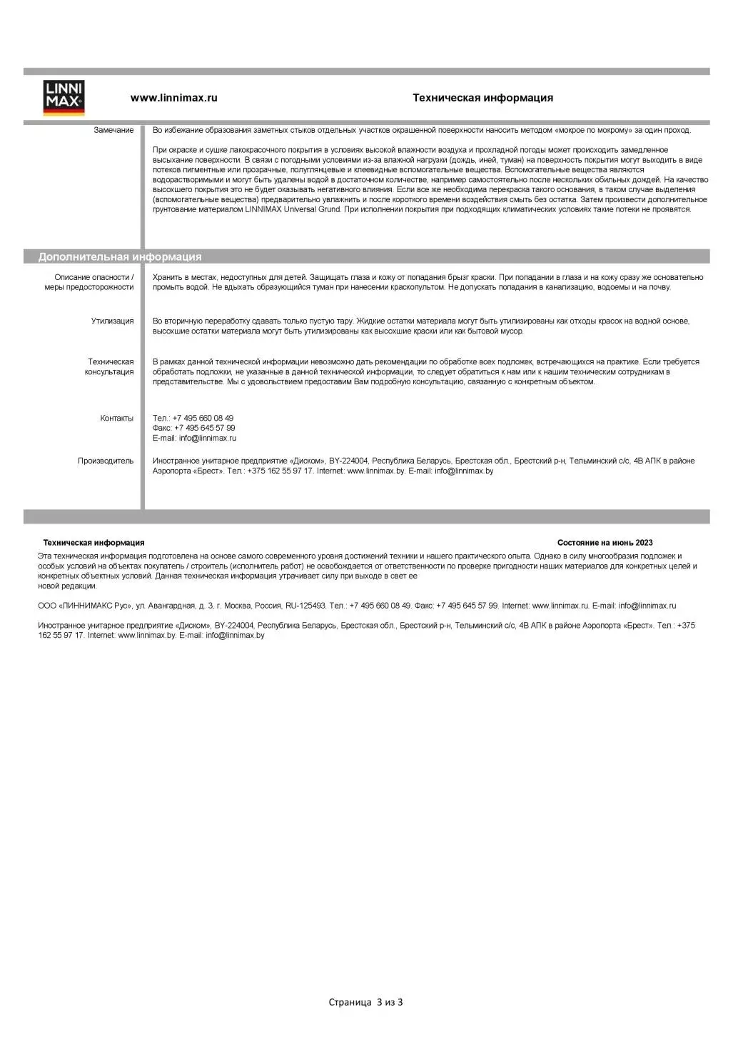 LINNIMAX Sauber Silikon Fassade колеруется вручную и машинным способом в системах LINNIMAX во все популярные цветовые коллекции. При колеровке краски вручную необходимо смешивать все требуемое количество материала во избежание отличий цветовых оттенков. Для предотвращения возможных отклонений оттенков рекомендуется перед применением проверять материал на точность соответствия требуемому тону. На основаниях, находящихся в одной плоскости, применять материал только одной производственной партии (см. номер партии на упаковке). Темным и насыщенным оттенкам присуща ограниченная укрывистость. При использовании таких оттенков рекомендуется предварительное нанесение пигментированных грунтовок либо кроющего покрытия на белой базе, заколерованной в оттенок, максимально близкий к финишному цветовому тону. В особых случаях все равно возможна необходимость второго кроющего покрытия.