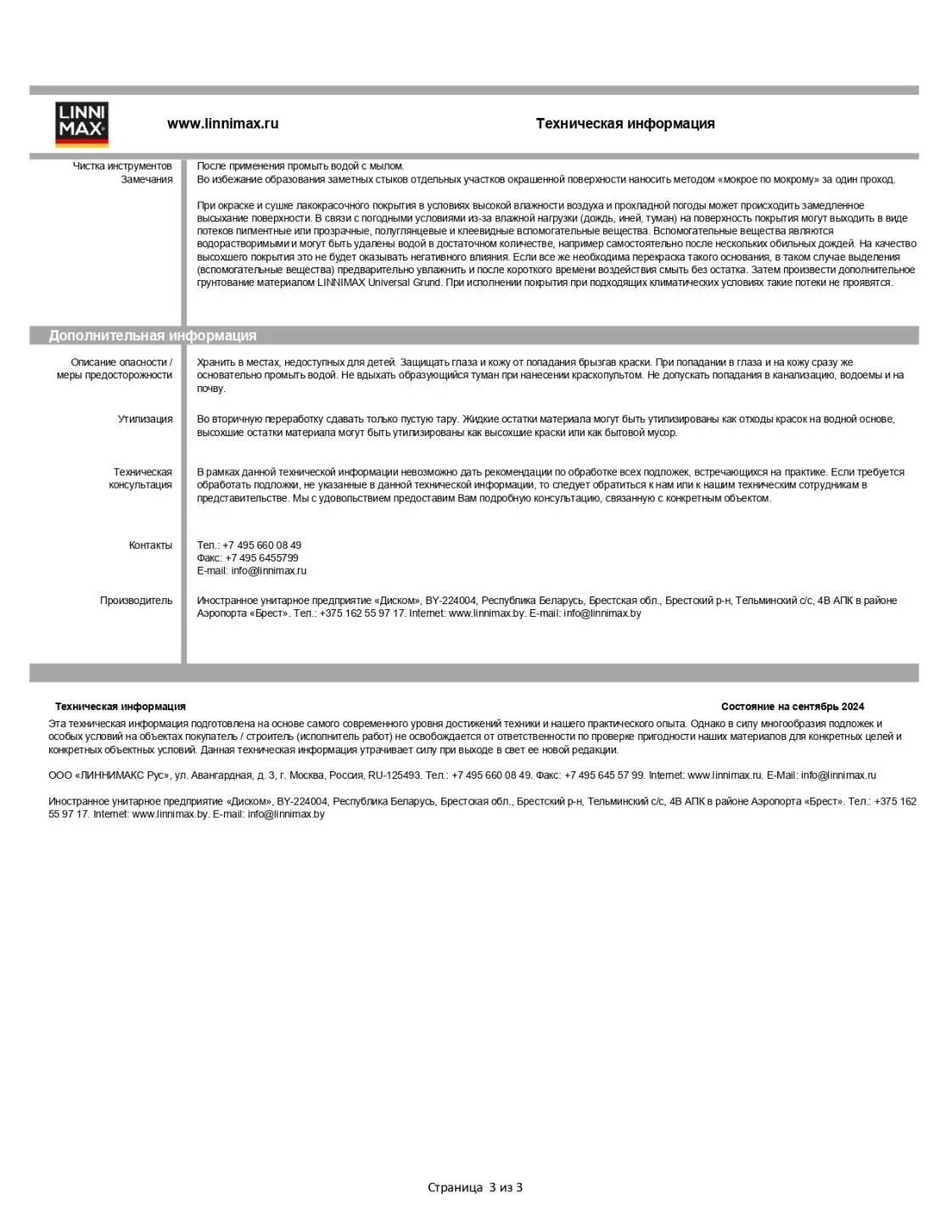 Белый LINNIMAX Silikon Master Fassade колеруется вручную и машинным способом в системах LINNIMAX во все популярные цветовые коллекции. При колеровке краски вручную необходимо смешивать все требуемое количество материала во избежание отличий цветовых оттенков. Для предотвращения возможных отклонений оттенков рекомендуется перед применением проверять материал на точность соответствия требуемому тону. На основаниях, находящихся в одной плоскости, применять материал только одной производственной партии (см. номер партии на упаковке). Темным и насыщенным оттенкам присуща ограниченная укрывистость. При использовании таких оттенков рекомендуется предварительное нанесение пигментированных грунтовок либо кроющего покрытия на белой базе, заколерованной в оттенок, максимально близкий к финишному цветовому тону. В особых случаях все равно возможна необходимость второго кроющего покрытия.