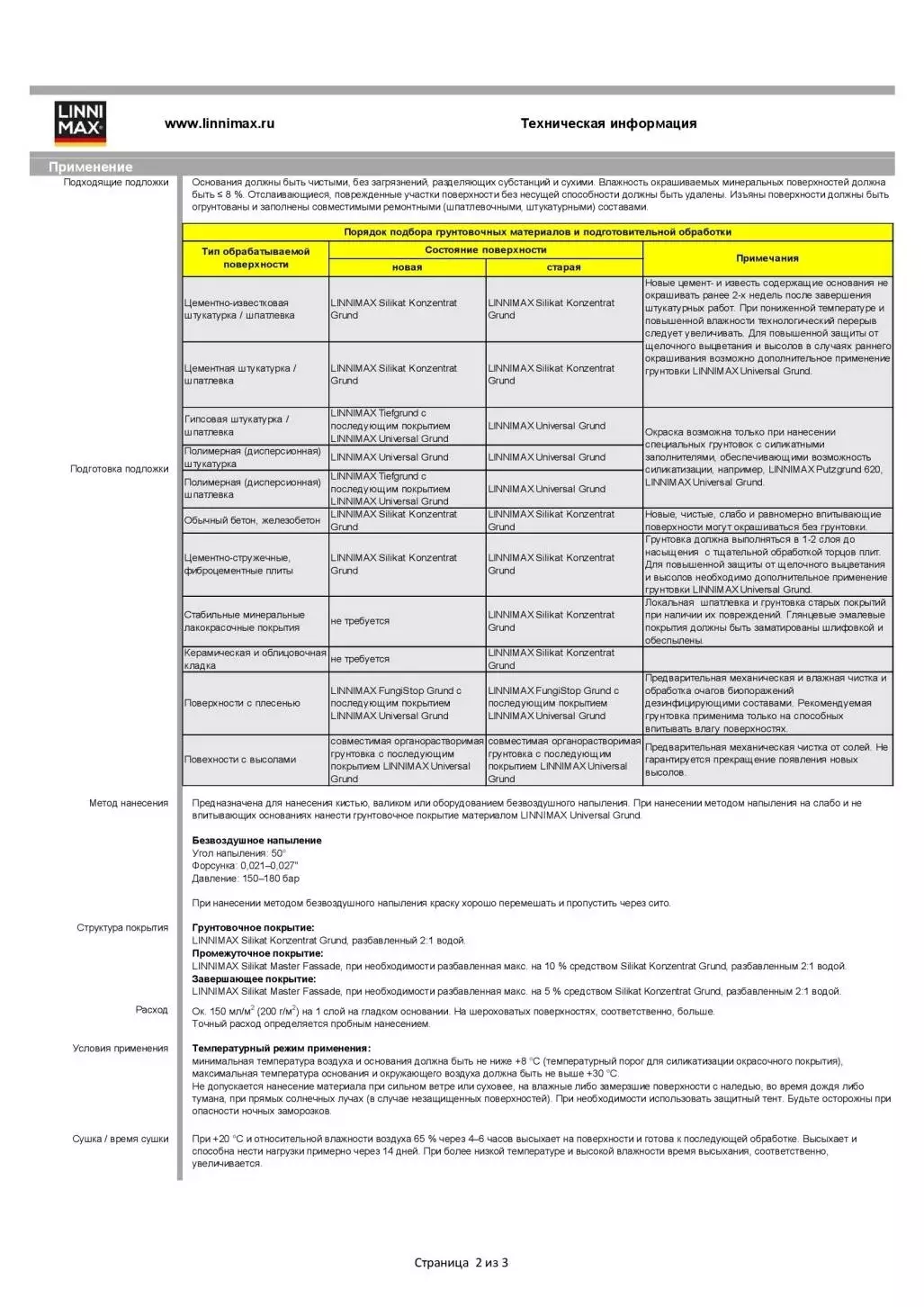 Основания должны быть чистыми, без загрязнений, разделяющих субстанций и сухими. Влажность окрашиваемых минеральных поверхностей должна быть ≤ 8 %. Отслаивающиеся, поврежденные участки поверхности без несущей способности должны быть удалены. Изъяны поверхности должны быть огрунтованы и заполнены совместимыми ремонтными (шпатлевочными, штукатурными) составами .