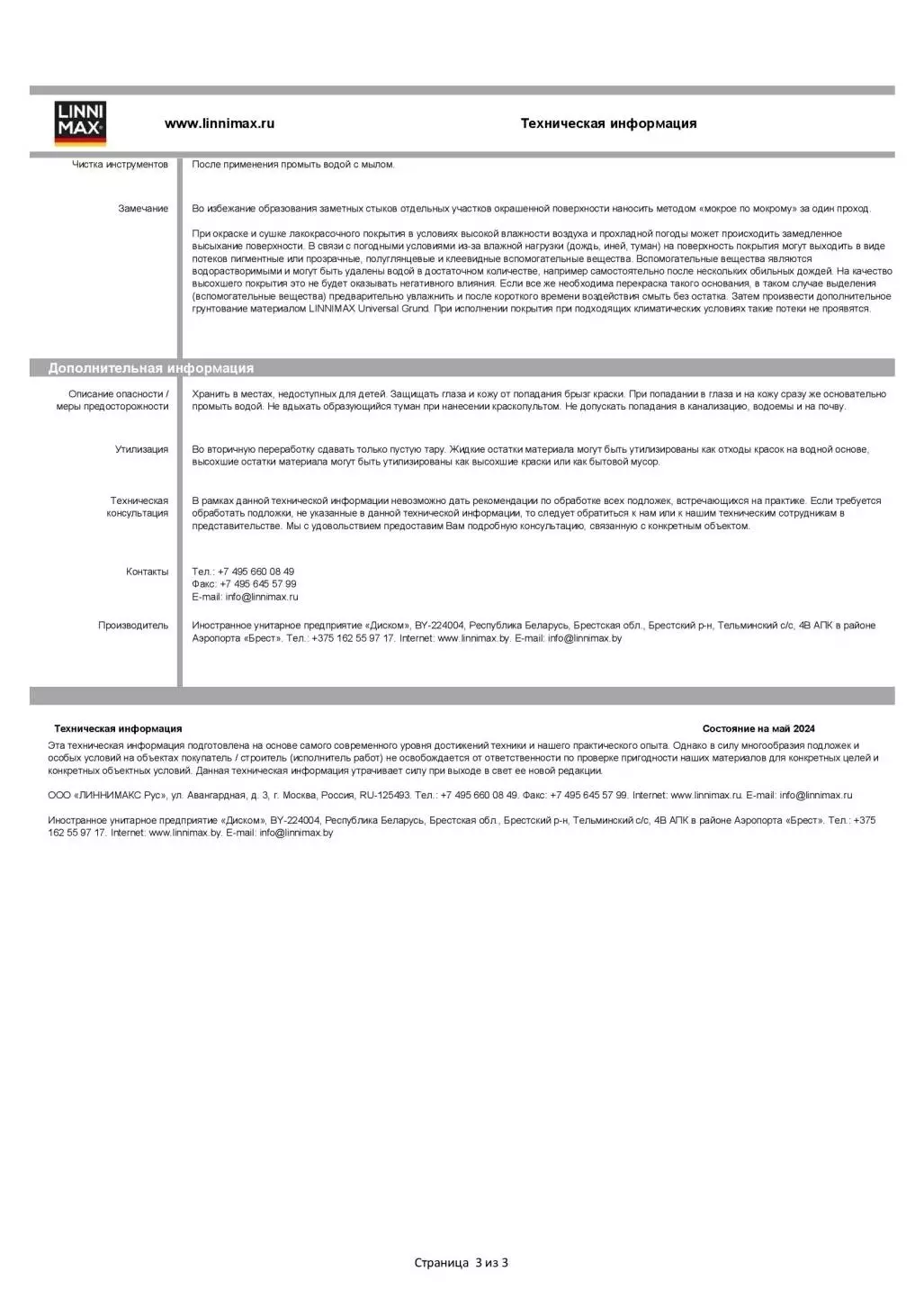 Белый LINNIMAX Silikat Master Fassade колеруется вручную и машинным способом в системе LINNIMAX во множество цветов на основе неорганических (минеральных) пигментов из популярных цветовых коллекций. При колеровке краски вручную необходимо смешивать все требуемое количество материала во избежание отличий цветовых оттенков. Для предотвращения возможных отклонений оттенков рекомендуется перед применением проверять материал на точность соответствия требуемому тону. На основаниях, находящихся в одной плоскости, применять материал только одной производственной партии (см. номер партии на упаковке). Темным и насыщенным оттенкам присуща ограниченная укрывистость. При использовании таких оттенков рекомендуется предварительное нанесение пигментированных грунтовок либо кроющего покрытия на белой базе, заколерованной в оттенок, максимально близкий к финишному цветовому тону. В особых случаях все равно возможна необходимость второго кроющего покрытия. Особенности колеровки в цветовые тона коллекции RAL Образцы цвета в веере RAL представлены с глянцевой оптикой покрытия, абсолютное большинство фасадных красок — матовые. Степень блеска влияет на цветовосприятие, матовые покрытия выглядят светлее, чем глянцевые, соответственно, визуально воспринимаемое отличие цвета не является дефектом точности колеровки. Большое количество образцов цвета коллекции RAL можно реализовать только органическими пигментами с малой стойкостью к УФ-излучению и щелочности окрашиваемых цемент- и известьсодержащих поверхностей. Обеспечение длительной стойкости цвета возможно только при подборе похожих альтернативных оттенков цвета, исполняемых стойкими неорганическими пигментами.