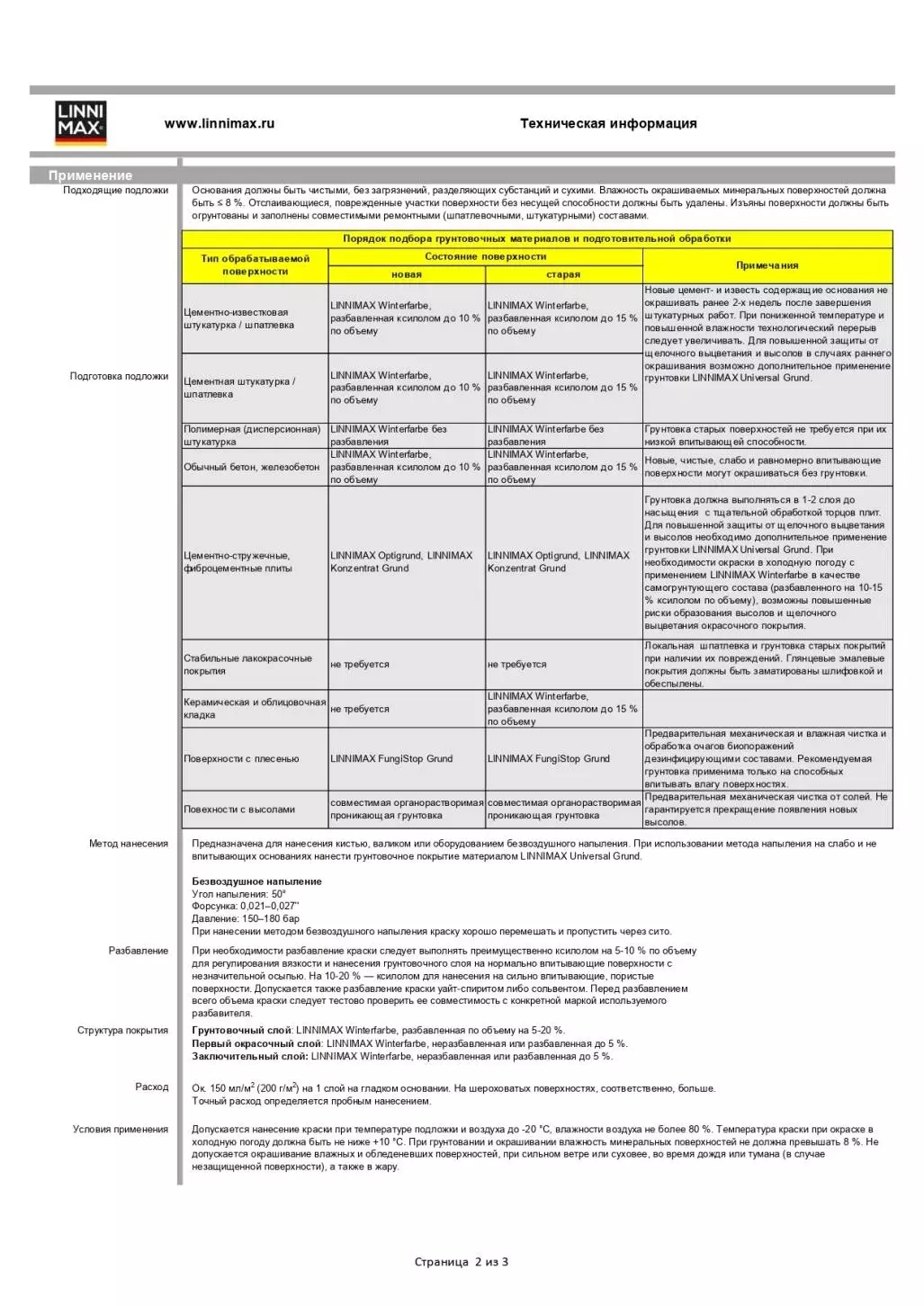 Предназначена для нанесения кистью, валиком или оборудованием безвоздушного напыления. При использовании метода напыления на слабо и не впитывающих основаниях нанести грунтовочное покрытие материалом LINNIMAX Universal Grund.