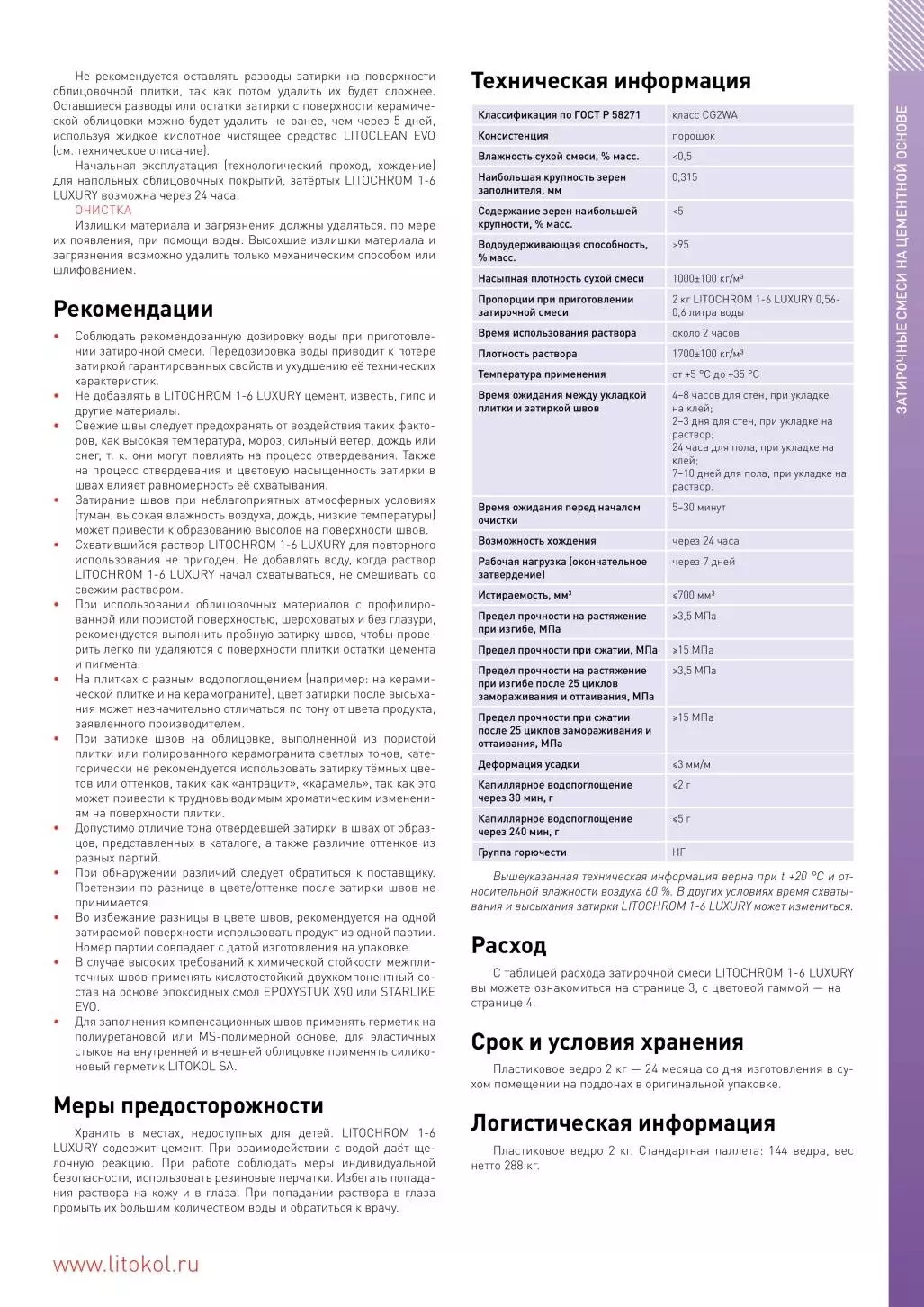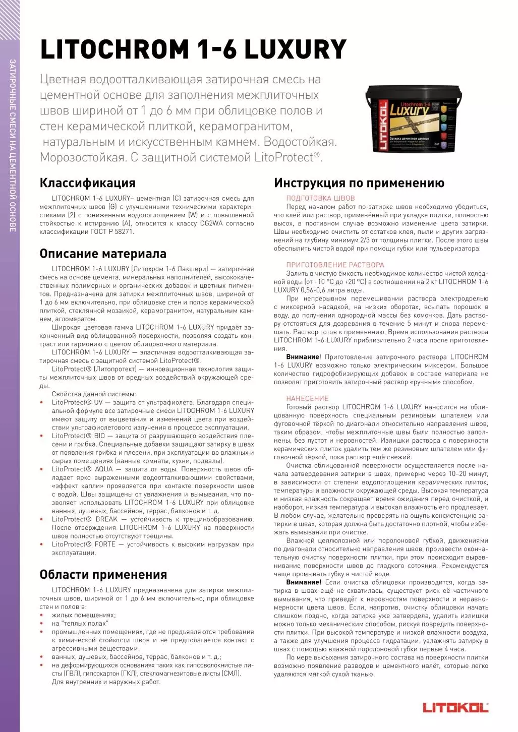 Затирочная смесь на цементной основе Litochrom 1-6 Luxury производится разработана на основе инновационной технологии защиты межплиточных швов LitoProtect, которая включает в себя защиту от влаги и ультрафиолета, от плесени и грибка. Она не дает усадки при высыхании, обладает чрезвычайной устойчивостью к трещинообразованию, благодаря чему может эксплуатироваться в сложных климатических условиях. Затирка Литохром Лакшери очень эластична, поэтому поглощает разность колебаний поверхностей, предотвращая, таким образом, отрывание плиток. Более того, затирка не вымывается и не выцветает, что позволяет ей надолго сохранять внешний вид облицовки. Специальный состав Litochrom Luxury предотвращает проникновение влаги под плитку, создавая, так называемый «эффект капли», проявляющийся при контакте поверхности швов с водой. Поверхность надежно защищена от увлажнения и вымывания. Затирка швов компенсирует дефекты калибра плитки и придаёт законченный вид облицованной поверхности. Обширная цветовая палитра затирки Литохром Лакшери более чем из 30-ти оттенков позволит, при необходимости, наиболее точно подобрать затирочную смесь Litochrom 1-6 Luxury Litokol к любой коллекции керамической плитки или керамогранита.