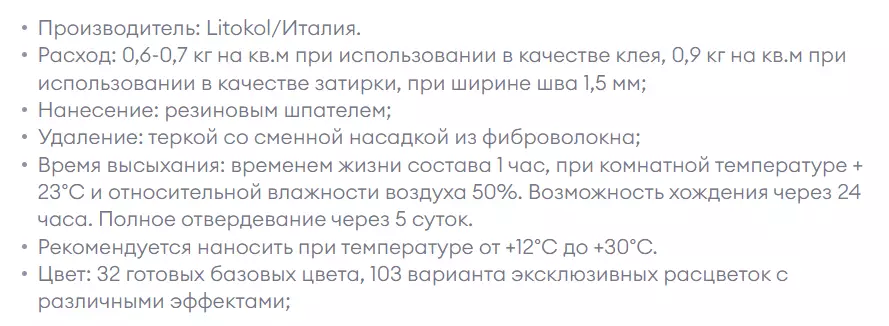 Двухкомпонентный кислотостойкий, щелочестойкий эпоксидный состав Litochrom Starlike используется для укладки плиточных материалов, мозаики и затирки межплиточных швов с шириной от 1 до 15 мм. Компания Litokol впервые представила эпоксидную затирку Старлайк в 2004 году и уже через год она была запущена в массовое производство. Эпоксидная затирка Litochrom Starlike состоит их двух компонентов – пастообразной смеси эпоксидной смолы, кремниевых инертных добавок и отвердителя. Единственная в мире запатентованная эпоксидная затирка, не окрашивающая плитку. Эпоксидная затирка Litokol Starlike имеет Европейский знак качества СЕ и является устойчивой не только к механическим нагрузкам, но и к воздействию кислотно-щелочной среды. Обладая уникальными эксплуатационными характеристиками состав абсолютно водонепроницаем, экологичен и не утрачивает своих свойств в широком диапазоне температур. Затирка Litokol не впитывает грязь, предотвращает образование грибков и плесени и по своей эластичности в 9 раз превышает аналогичные показатели цементных затирок для швов. Полупрозрачная структура эпоксидной затирки, придаёт замечательный оптический эффект, а при использовании специальных добавок, можно добиться потрясающего эффекта, создать вид металлизированной поверхности, и придать элегантность и индивидуальность. Необычайная лёгкость очистки поверхности плитки после затирки швов, делает Litokol Litochrom Starlike одним из лучших составов для работы с плиточными материалами.