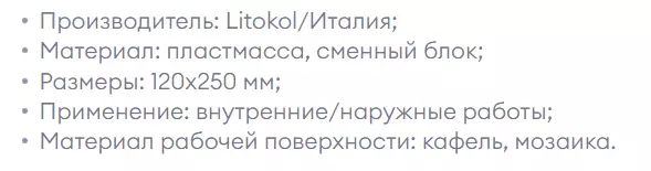 Работа с таким составом, как эпоксидная затирка имеет свои сложности. Зачастую удалить её остатки с поверхности облицовки, бывает весьма затруднительно. Специально для этих целей специалисты компании Litokol разработали специальный шпатель для размягчения эпоксидной затирки. Шпатель Литокол из синтетического волокна позволяет быстро очистить облицованную поверхность, не повреждая плиточный шов. Тонкие ворсинки фиброволокна проникают в мельчайшие углубления и микротрещины, эффективно вычищая загрязнения даже с шероховатых поверхностей неполированных плиток. Также с его помощью можно без следа удалить разводы с плитки. Корпус шпателя имеет удобную ручку и прочное прямоугольное основание, к которому крепятся сменные блоки из синтетического материала размером 120х250 мм. В комплекте со шпателем поставляется два вида блоков, отличающихся по цвету и надежно крепящихся к корпусу шпателя с помощью "липучек". Сменный блок белого цвета изготовлен из мягкого синтетического материала и предназначен для очистки от свежих остатков эпоксидной затирки. Черный блок выполнен в более жестком варианте и используется для затвердевших остатков. Съёмные сменные блоки могут переворачиваться и мыться, а также использоваться самостоятельно.