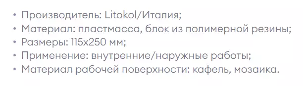 Шпатель Litokol для цементной затирки отличается прочностью и износостойкостью и используется для нанесения строительных смесей, таких как плиточный клей, шпатлевка и другие растворы. Несмотря на то, что он служит в основном для затирки швов между стыками в кафельной плитке, синий резиновый шпатель Литокол будет очень полезен для нанесения герметика, клея, при кладке плитки во время ремонта или строительства. Также его можно применять для заделки стыков в паркете, а также снятия остатков строительной смеси. Используется профессиональными плиточниками при выравнивании стен, потолков и других поверхностей, а также для реставрационных работ и финишной обработки.