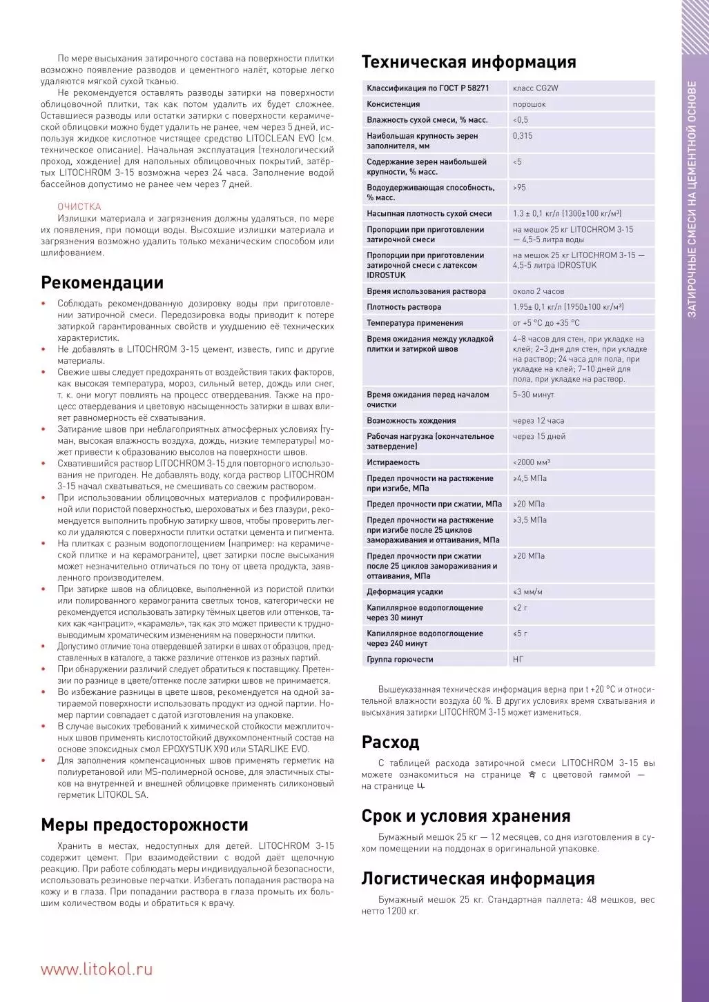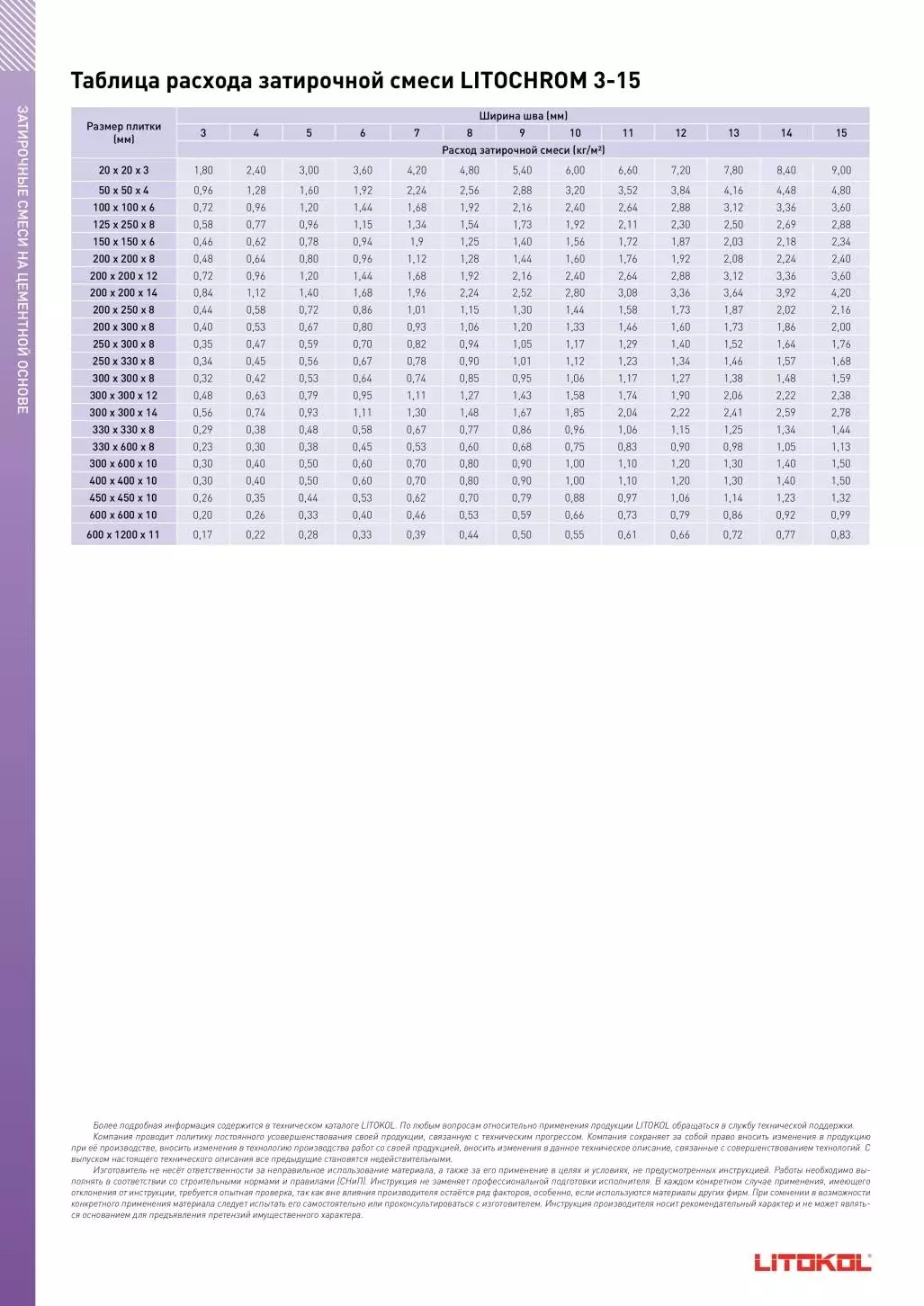 LITOCHROM 3-15 - цементная затирочная смесь для межплиточных швов с улучшенными техническими характеристиками и пониженным водопоглощением относится к классу CG2W.