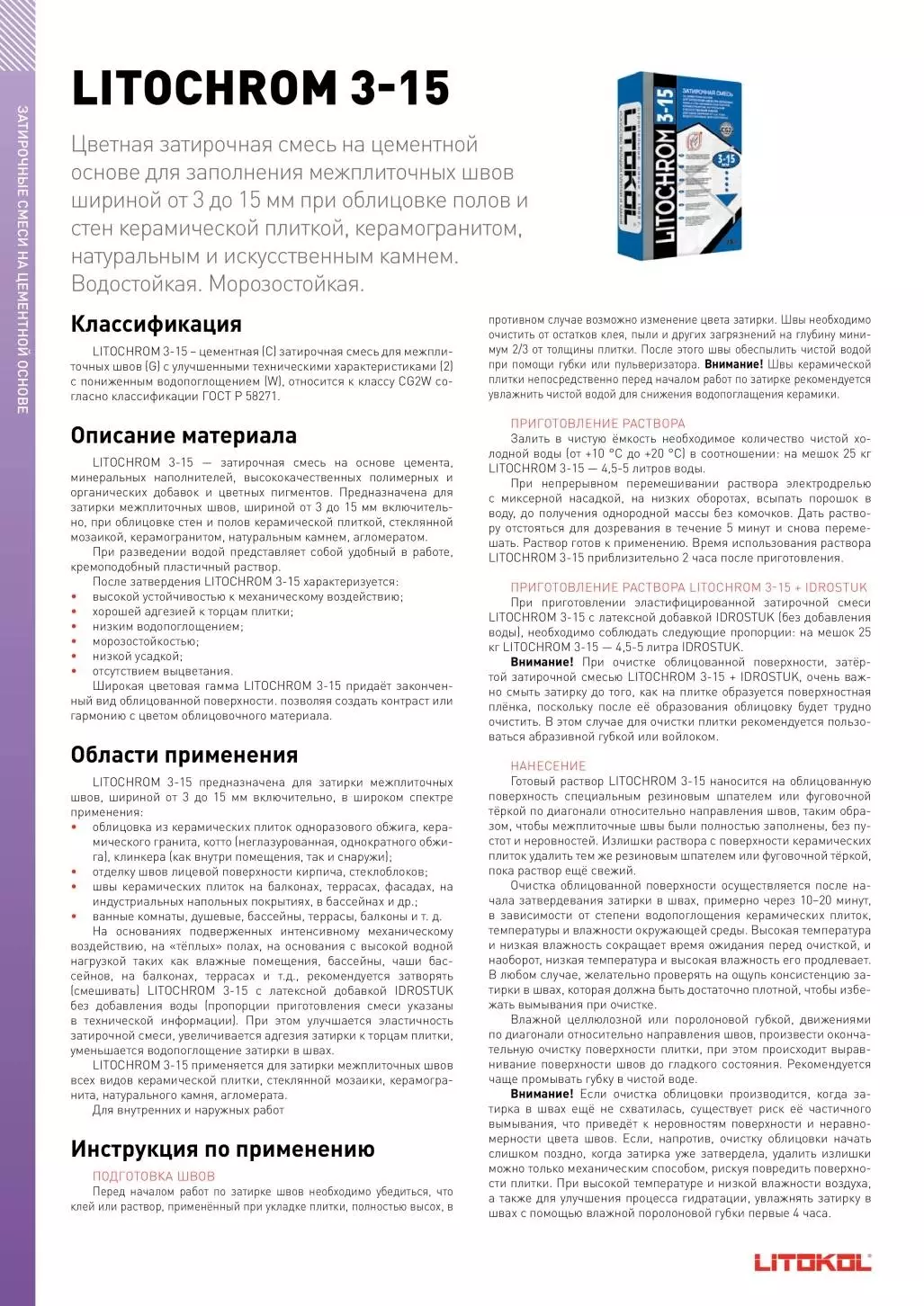 LITOCHROM 3-15 — цементная (С) затирочная смесь для межплиточных швов (G) с улучшенными техническими характеристиками (2) относится к классу CG2 согласно классификации Европейских Норм 13888 и по ГОСТ Р 58271. LITOCHROM 3-15 — затирочная смесь на основе цемента, минеральных наполнителей, высококачественных полимерных и органических добавок и цветных пигментов. Предназначена для затирки межплиточных швов, шириной от 3 до 15 мм включительно, при облицовке стен и полов керамической плиткой, стеклянной мозаикой, керамогранитом, натуральным камнем, агломератом.
