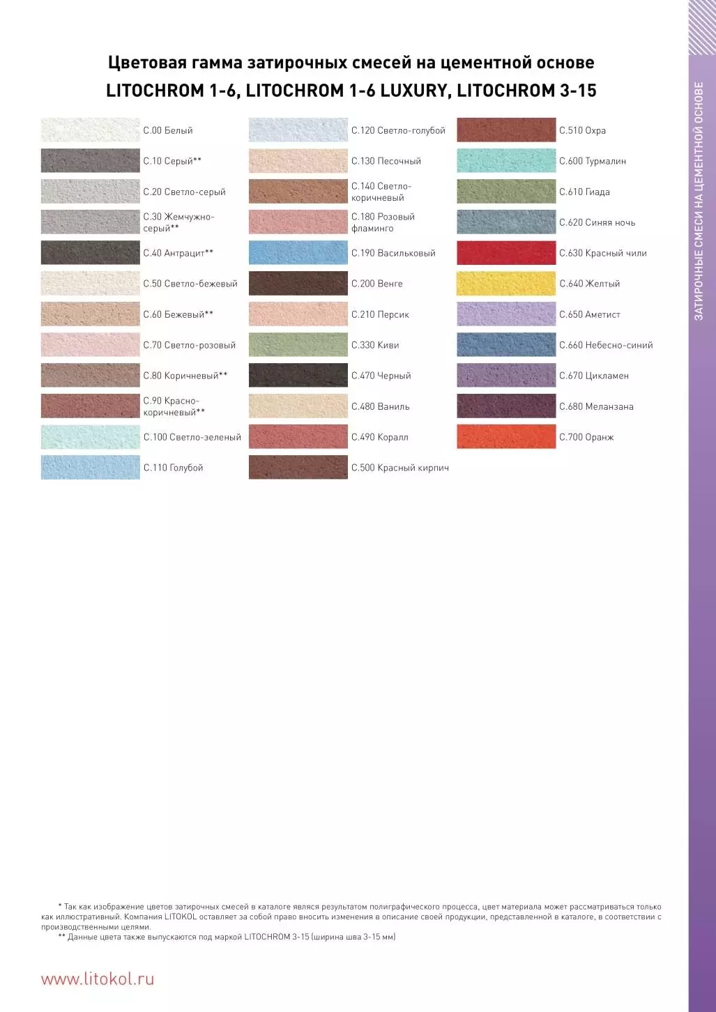 LITOKOL LITOCHROM 3-15 - фуга на основе цемента, минеральных наполнителей, высококачественных полимерных и органических добавок и цветных пигментов. Предназначена для затирки межплиточных швов, шириной от 3 до 15 мм включительно, при облицовке стен и полов керамической плиткой, стеклянной мозаикой, керамогранитом, натуральным камнем, агломератом.