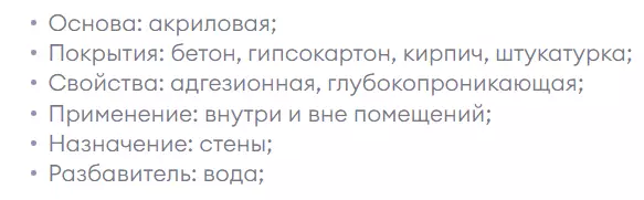 Для наружных и внутренних работ. Рекомендуется для нанесения на просохшие минеральные поверхности (бетон, штукатурку, кирпич и т. п.), а также гипсокартон, предварительно подготовленные ранее окрашенные поверхности.