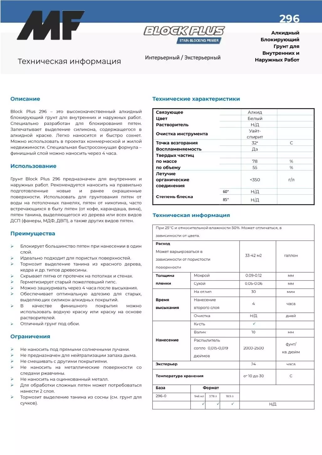 MF Paints Block Plus 296 Алкидный блокирующий грунт для внутренних и наружных работ