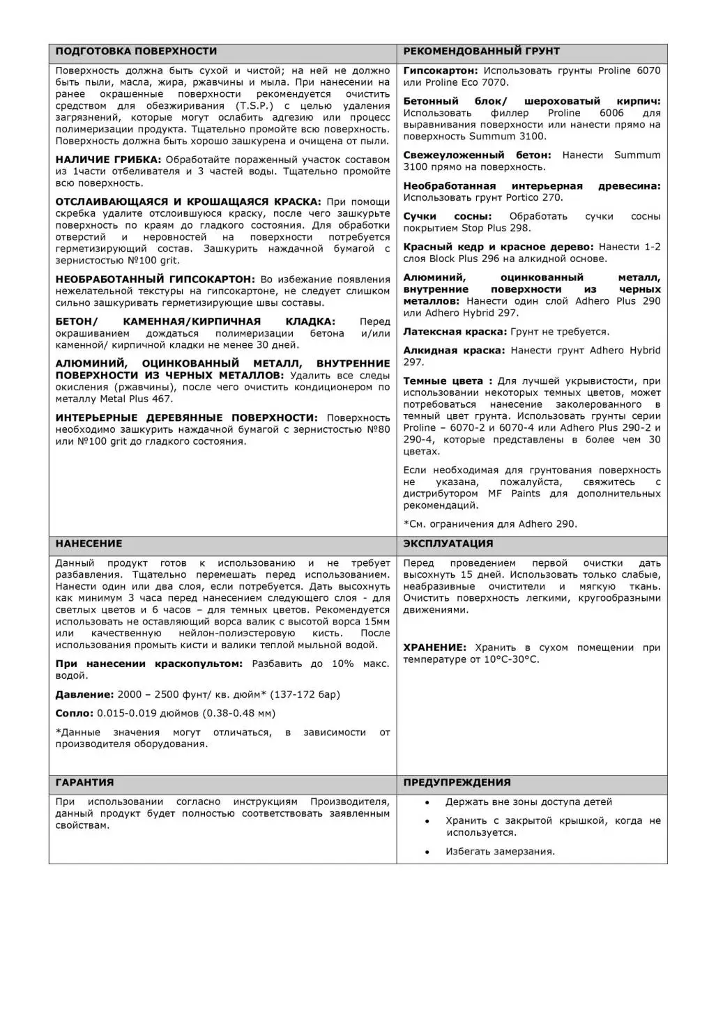При нанесении краски следует учитывать некоторые ограничения. Не рекомендуется использовать краску для нанесения на полы, под прямыми солнечными лучами, при температуре ниже 10 градусов. Также не следует смешивать MF Paints Summum с другими красками. Проводить влажную уборку не ранее чем через 15 дней после нанесения.