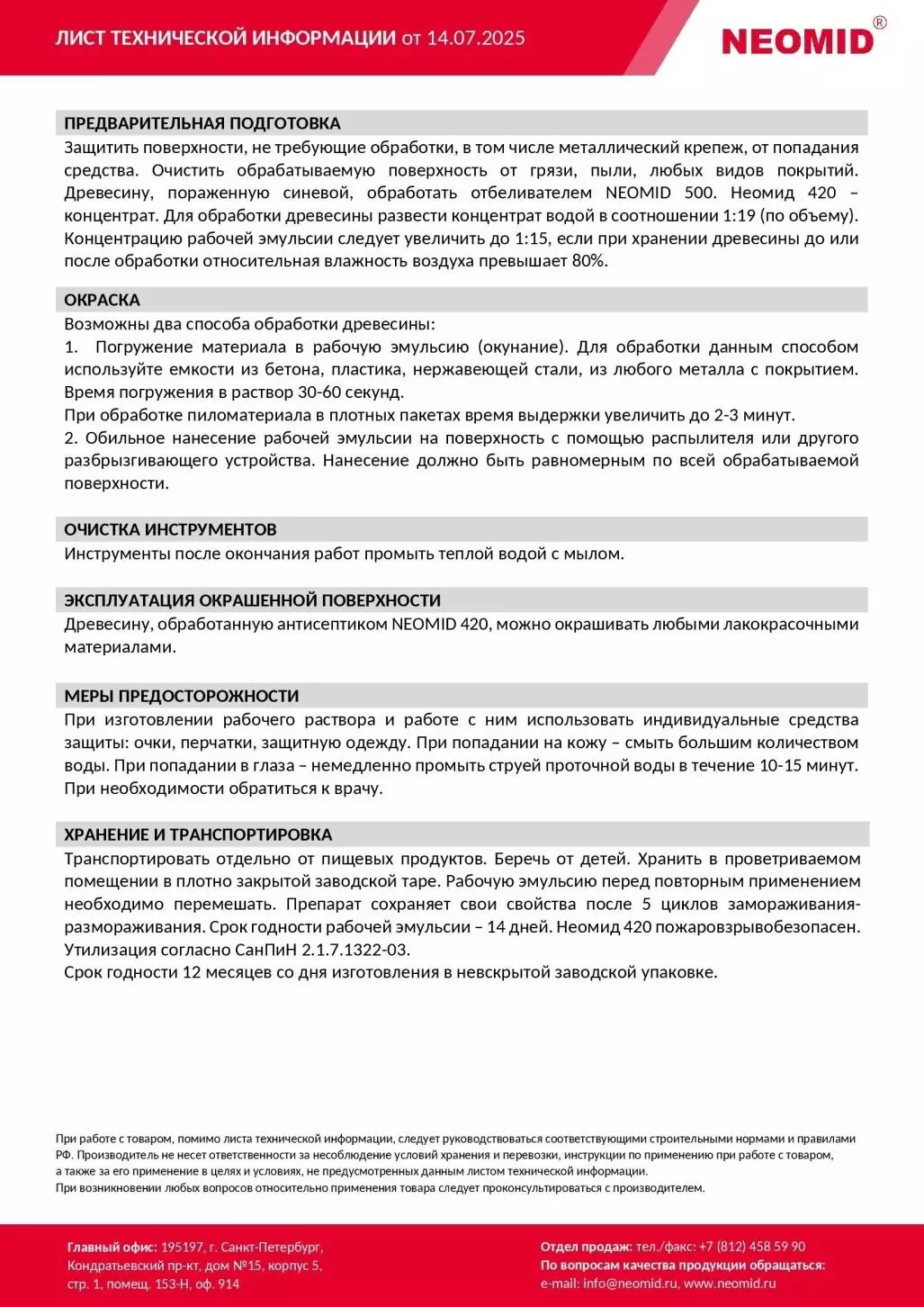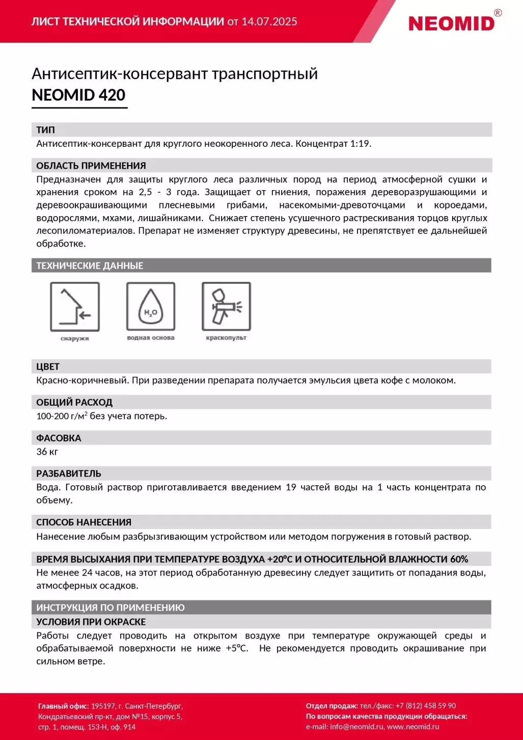 NEOMID 420 — транспортный антисептик-консервант для защиты круглого, неокоренного леса, концентрат 1:19. Применяется на период атмосферной сушки и хранения древесины сроком на 2,5 — 3 года.
