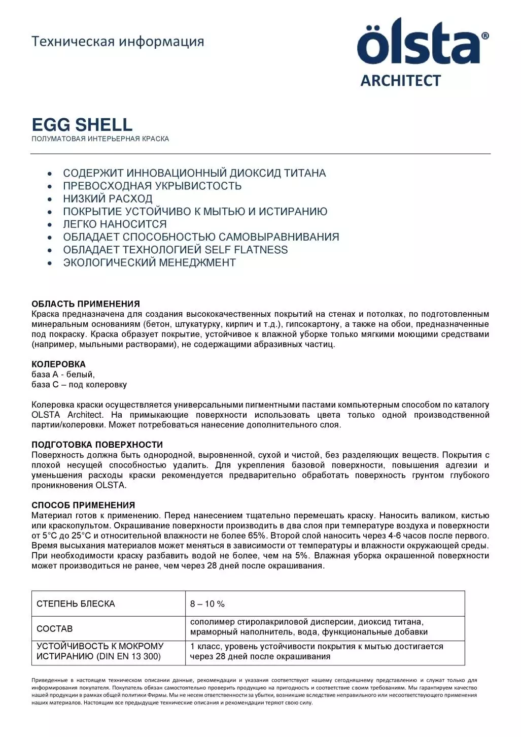 Olsta Architect Eggshel Краска интерьерная с повышенным уровнем эксплуатации полуматовая