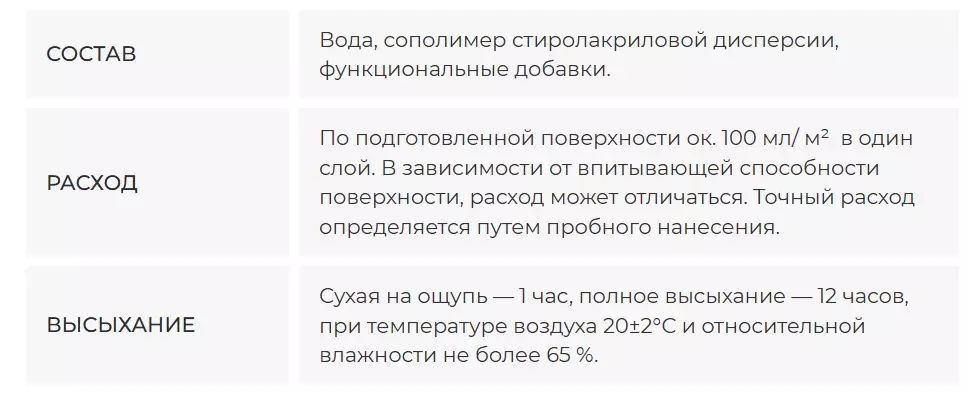 Материал готов к применению. Наносить валиком или кистью. Грунтование поверхности производить в зависимости от впитывающей способности подложки в неразбавленном виде в один или два слоя при температуре воздуха и поверхности от 5°С до 25°С и относительной влажности не более 65%. При нанесении в два слоя наносить методом «мокрое по мокрому». После нанесения грунтовка не должна образовывать блестящее покрытие. Избыточный мокрый материал, который не впитывается в поверхность, следует своевременно удалить или распределить малярным инструментом на необработанные участки поверхности. Время высыхания до нанесения финишного покрытия – 12 часов.