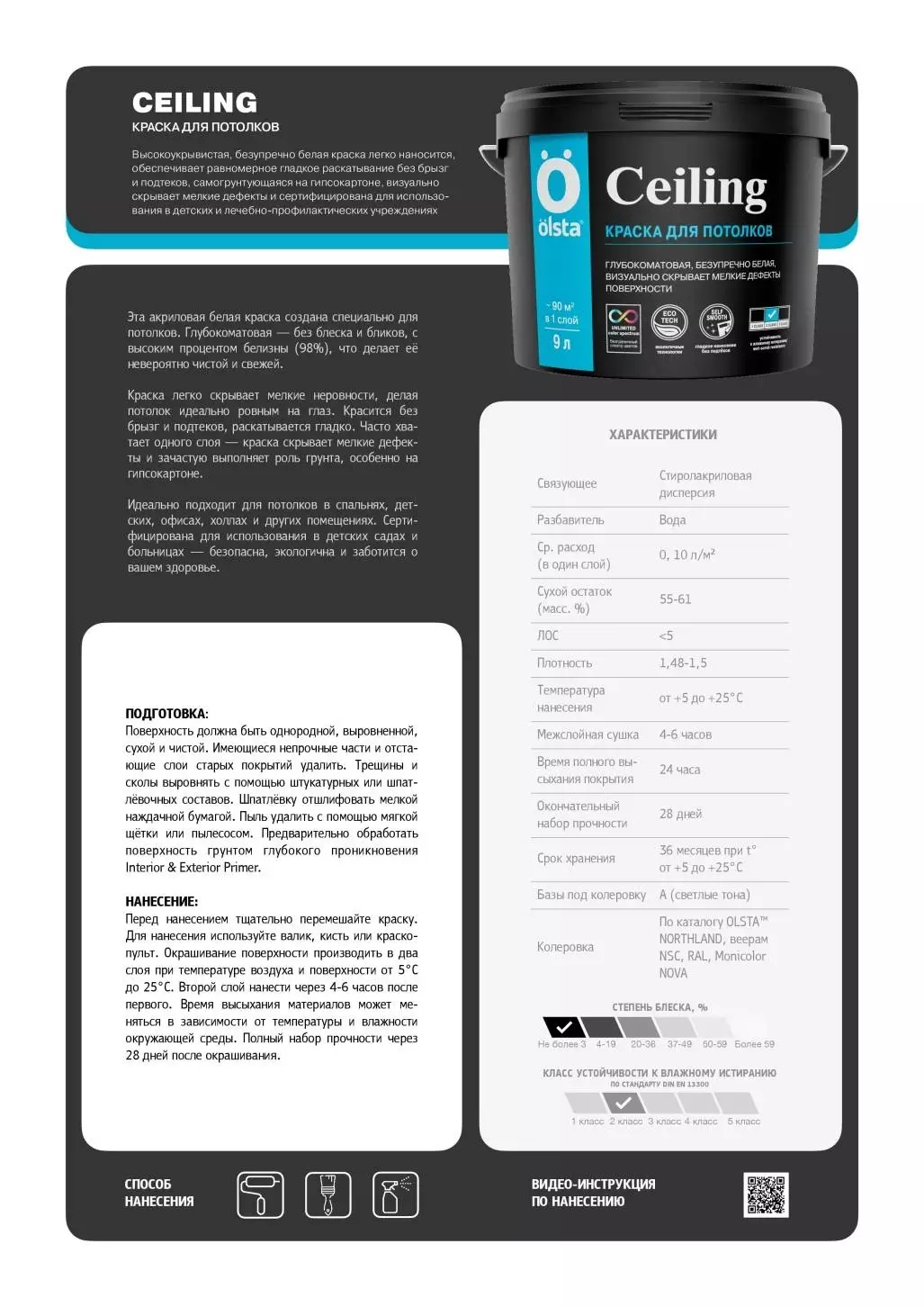 Краска для потолков Olsta Ceiling предназначена для нанесения на предварительно подготовленные минеральные основания: бетон, бетонные блоки, кирпичная кладка, цемент, цементная штукатурка, гипс, гипсовые и гипсокартонные плиты и т.д.