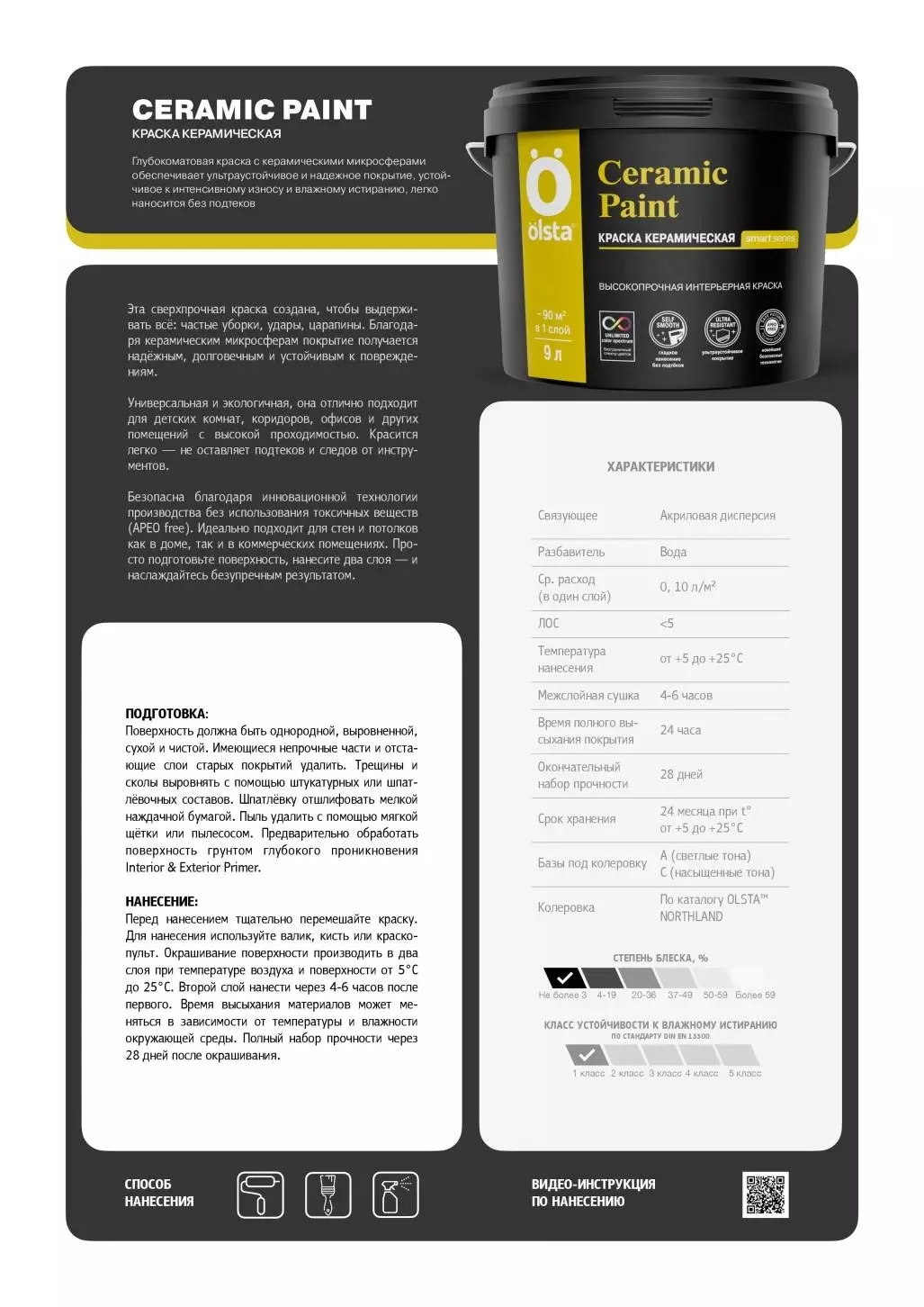 Краска создает сверхпрочное глубокоматовое покрытие с керамическими микросферами. Она обладает повышенной износостойкостью (1 класс влажного истирания) и формирует устойчивое к повреждениям покрытие. Состав легко наносится и не оставляет подтеков. Продукция произведена по экологичной технологии APEO free и подходит для применения как в жилых, так и в коммерческих объектах. Она может использоваться в гостиных и детских комнатах, кухнях и коридорах, помещениях с повышенной проходимостью.
