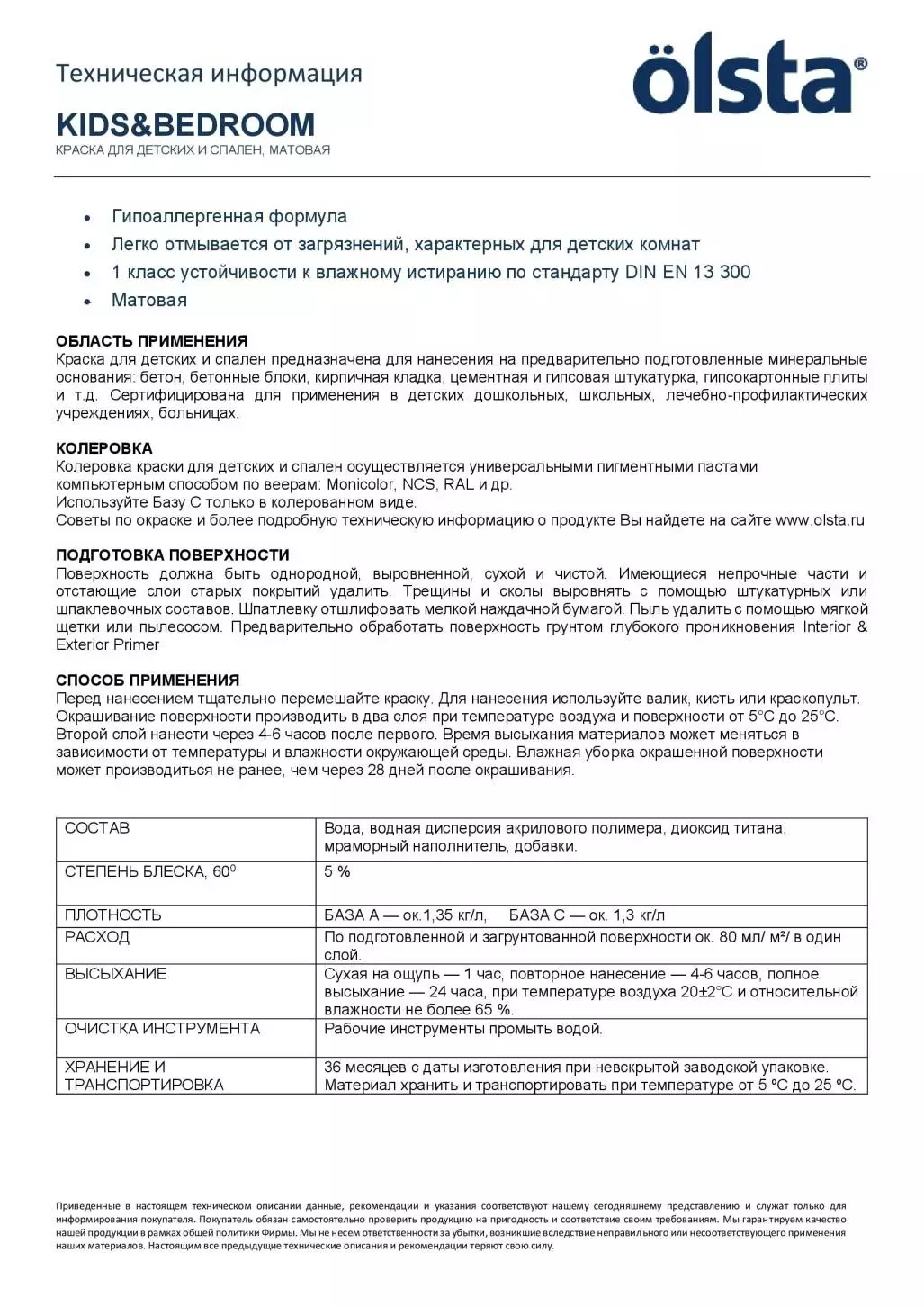 Краска для детских и спален предназначена для нанесения на предварительно подготовленные минеральные основания: бетон, бетонные блоки, кирпичная кладка, цемент, цементная штукатурка, гипс, гипсовые и гипсокартонные плиты и т.д.