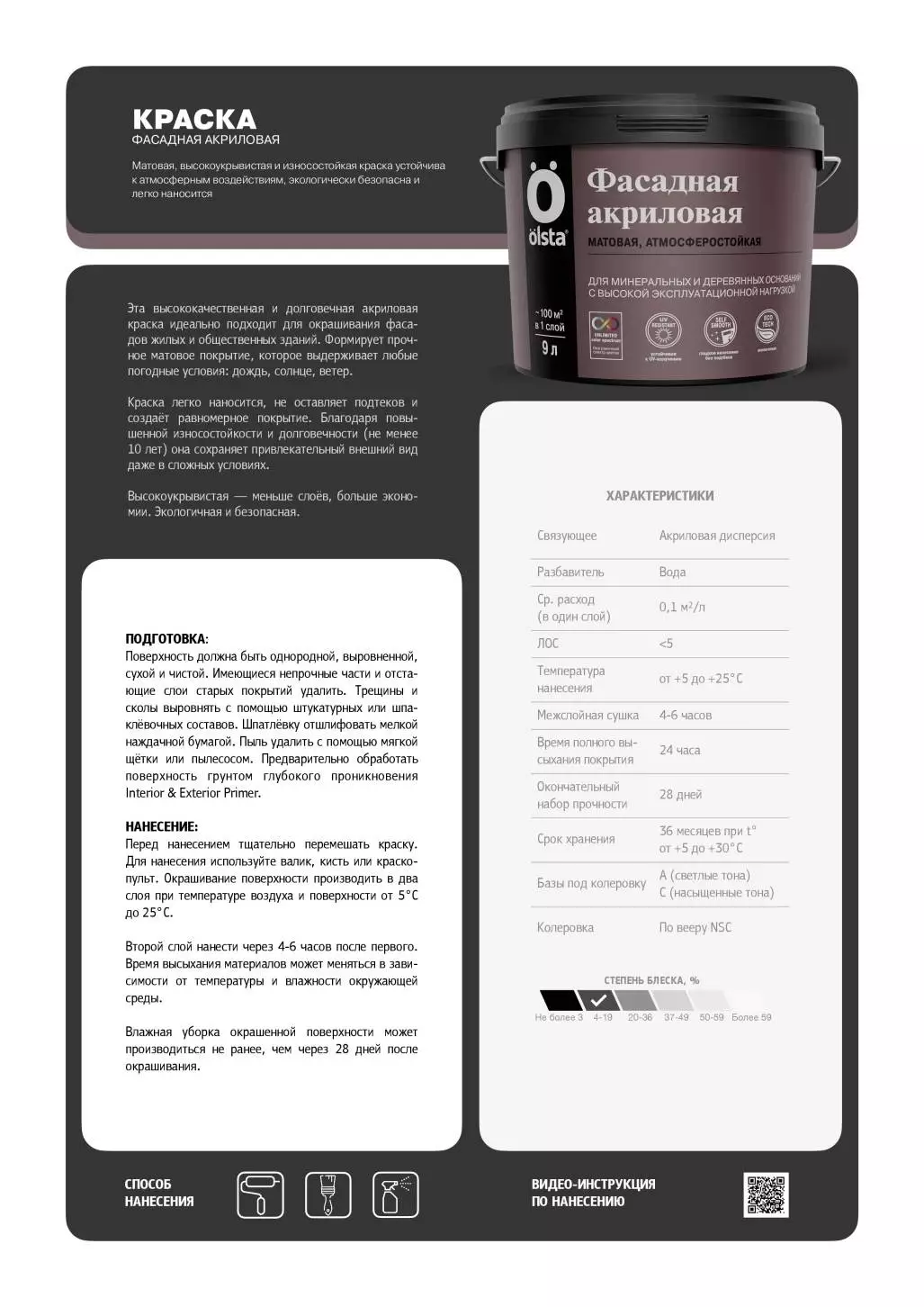 Краска фасадная акриловая предназначена для нанесения на предварительно подготовленные минеральные основания: бетон, бетонные блоки, кирпичная кладка, цементная штукатурка и т.д. Не наносить при прямых солнечных лучах, сильном ветре, тумане или высокой влажности. Не наносить в дождь.