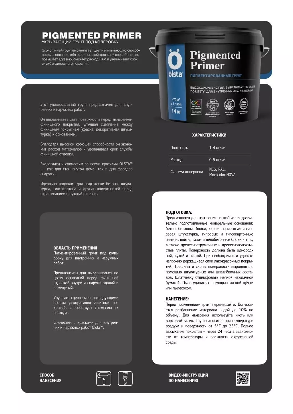 Грунт Olsta Pigmented Primer пигментированный под колеровку для внутренних и наружных работ предназначен для выравнивания по цвету оснований перед финишной отделкой внутри и снаружи зданий и помещений. Улучшает сцепление с последующими слоями декоративно-защитных покрытий, способствует снижению их расхода. Совместим с красками и фактурными покрытиями для внутренних и наружных работ OLSTA.