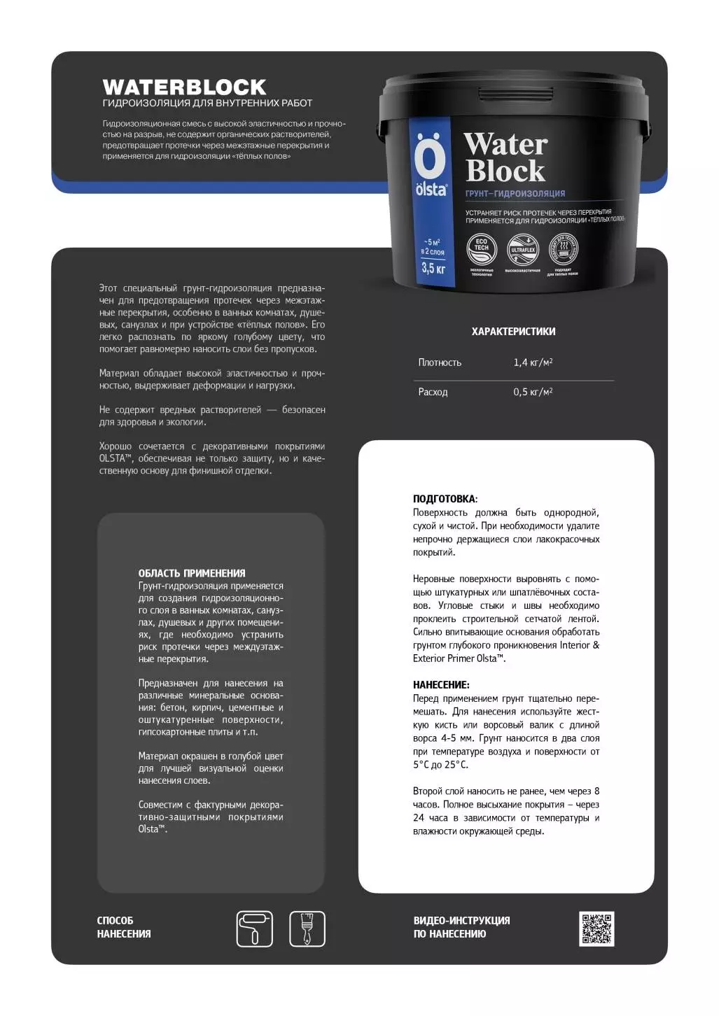 Гидроизоляция Olsta Waterblock для внутренних работ для влажной среды применяется для создания гидроизоляционного слоя в ванных комнатах, санузлах, душевых и других помещениях, где необходимо устранить риск протечки через межэтажные перекрытия. Материал окрашен в голубой цвет для лучшей визуальной оценки нанесения слоев. Совместим с фактурными декоративно-защитными покрытиями OLSTA.