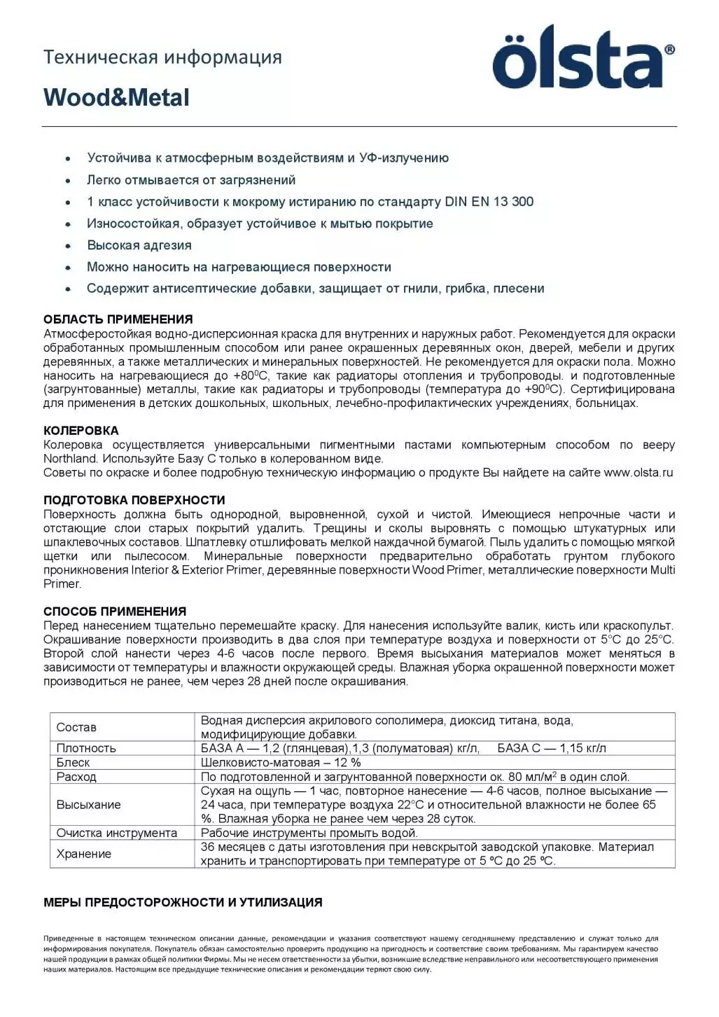 Краска Олста Вуд/Металл краска универсальная по дереву и металлу для внутренних и наружных работ. Рекомендуется для окраски обработанных промышленным способом или ранее окрашенных деревянных окон, дверей, мебели и других деревянных, а также металлических поверхностей.