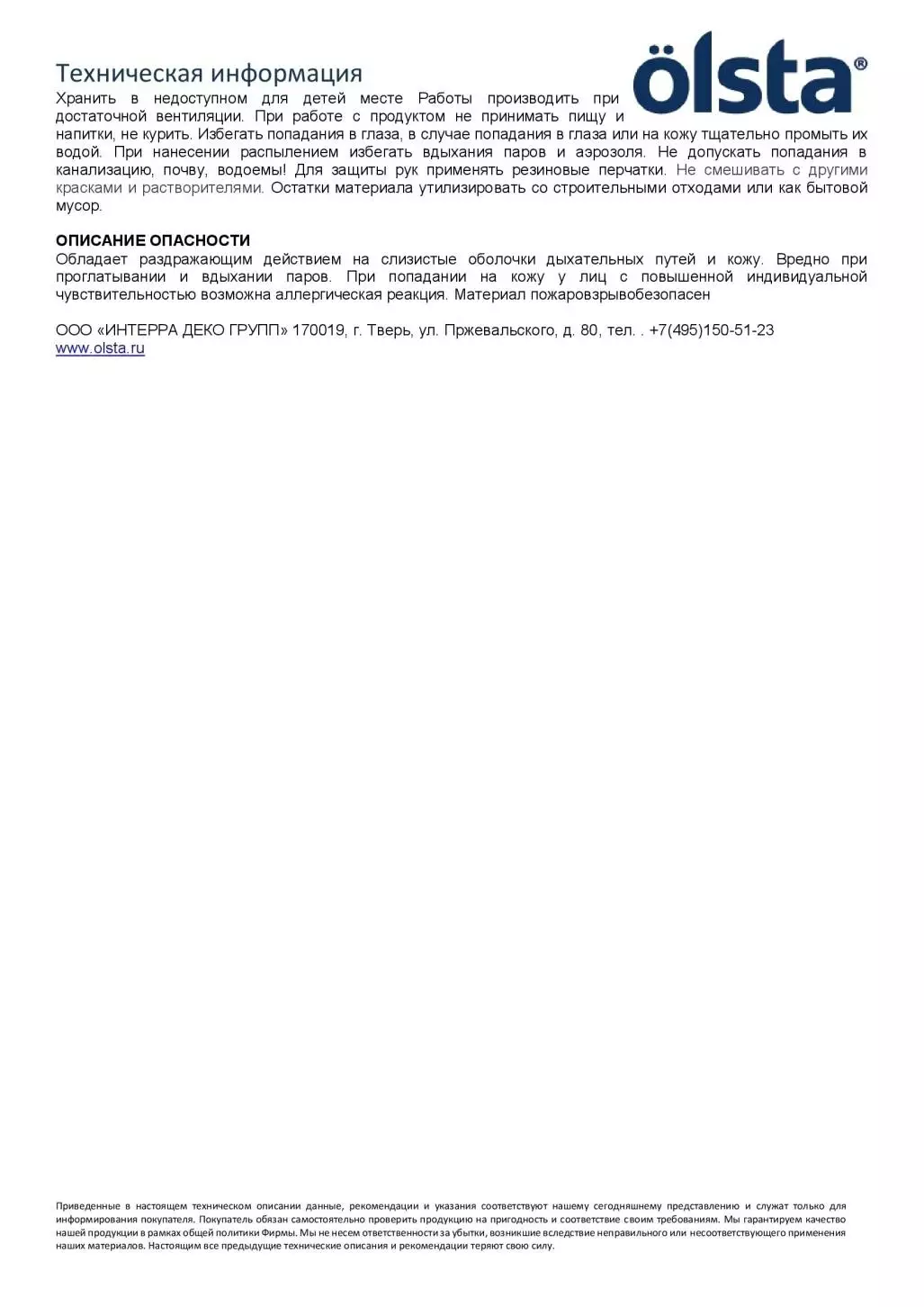 Для уменьшения расхода и улучшения адгезии минеральных поверхности предварительно обработать грунтом глубокого проникновения OLSTA Interior Primer , деревянных поверхностей OLSTA Wood Primer. Металлические и пластиковые поверхности обработать специальным грунтом Universal Primer.