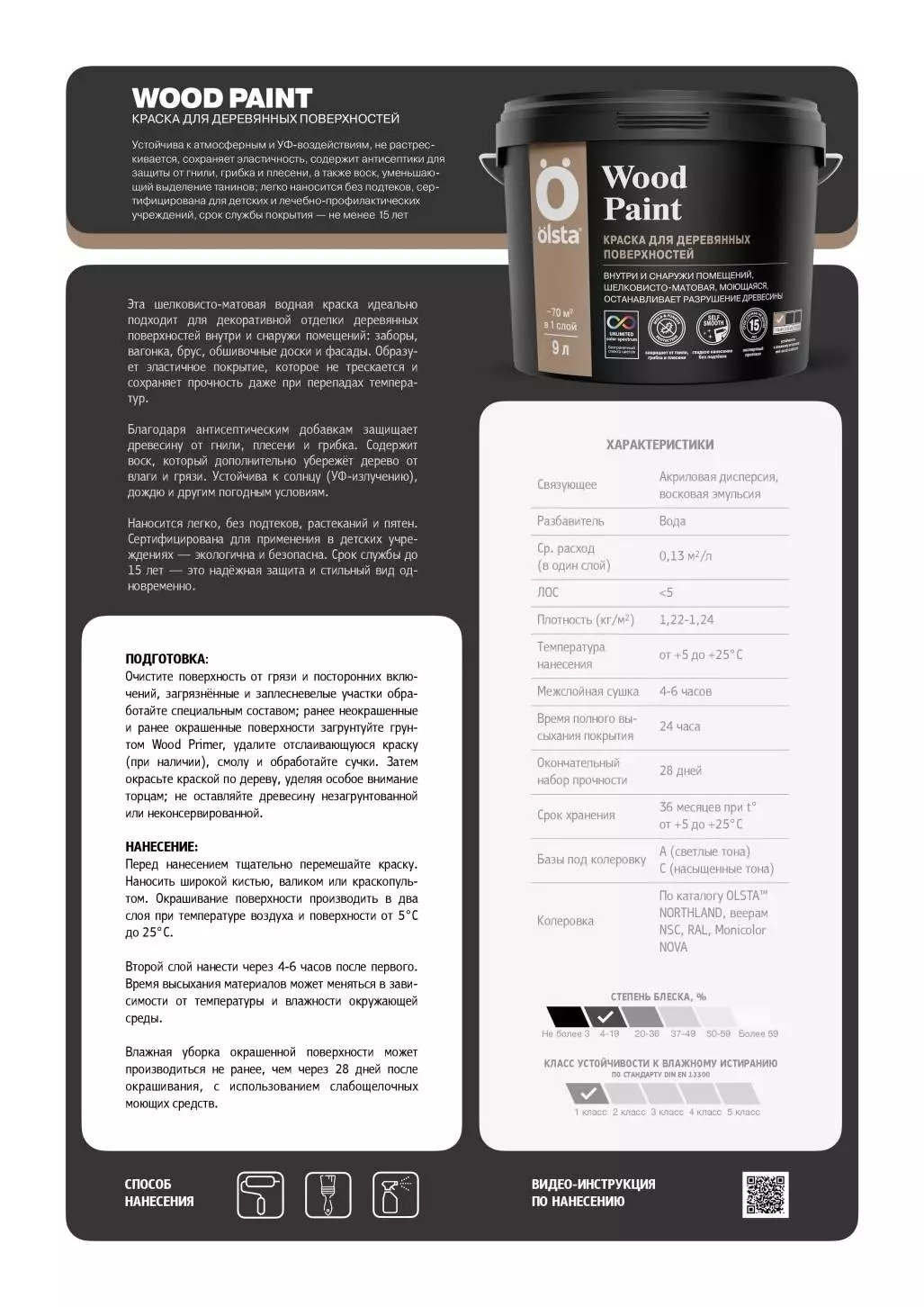 Olsta Wood Paint Краска акриловая для деревянных поверхностей для внутренних и наружных работ