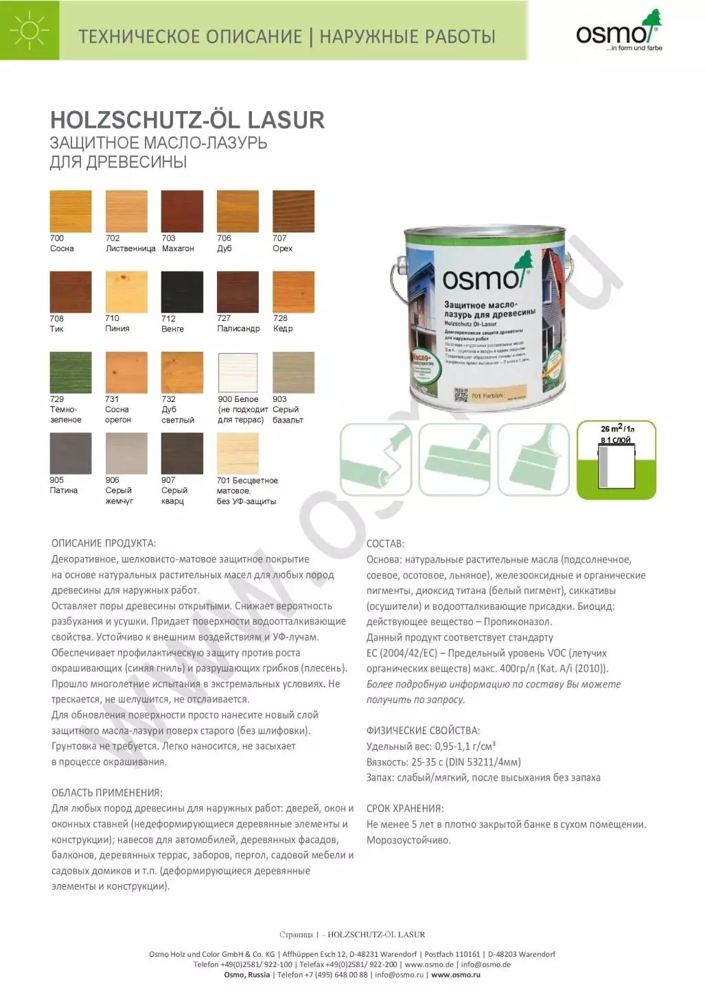 Декоративное, шелковисто-матовое Защитное покрытие на основе натуральных масел для древесины для наружных работ. Оставляет поры открытыми, сохраняя способность древесины «дышать», снижает разбухание и усушку. Придает поверхности водоотталкивающие свойства. Устойчиво к внешним воздействиям и УФ-лучам. Hе трескается, не шелушится, не отслаивается. Для обновления покрытия просто нанесите новый слой поверх старого (без шлифовки). Грунтовка не требуется. Наносится легко, равномерно, без наплывов. Hе засыхает в процессе окрашивания. Содержит небольшое количество растворителей, не содержит биоцидов и консервантов. Благодаря большому количеству твердых частиц имеет чрезвычайно экономичный расход. Всего один очень тонкий слой лазури обеспечивает оптимальную защиту поверхности. Высохшее покрытие безопасно для людей, животных и растений (устойчиво к слюне и поту (DIN 53160), подходит для детских игрушек (EN 71.3)).