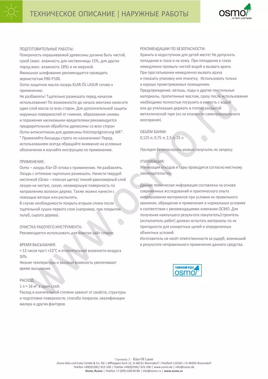 Не разбавлять! Тщательно размешать перед началом использования! По возможности до начала монтажа нанесите один слой масла со всех сторон. Для дополнительной защиты наружных поверхностей от гниения, образования синевы и поражения насекомыми-вредителями рекомендуется предварительная обработка древесины со всех сторон Osmo-антисептиком для древесины Holzimprägnierung WR*.