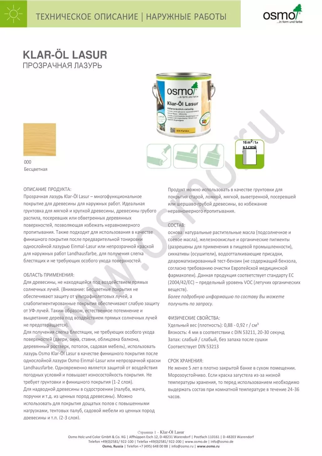 Для получения слегка блестящих, не требующих особого ухода поверхностей (двери, окна, ставни, облицовка балкона, деревянный ростверк, потолок, садовая мебель), использовать лазурь Osmo Klar-Öl Lasur в качестве финишного покрытия после однослойной лазури Osmo Einmal-Lasur или непрозрачной краски Landhausfarbe. Одновременно является защитой от воздействия погодных условий и повышает износостойкость покрытия. Не требует грунтовки и финишного покрытия (1-2 слоя).