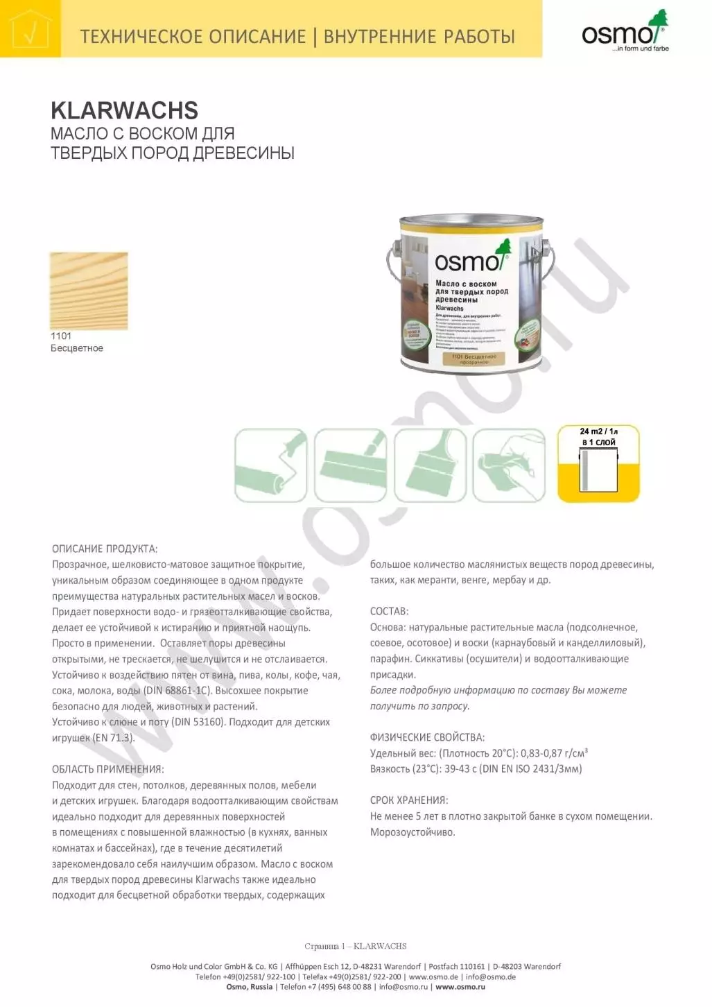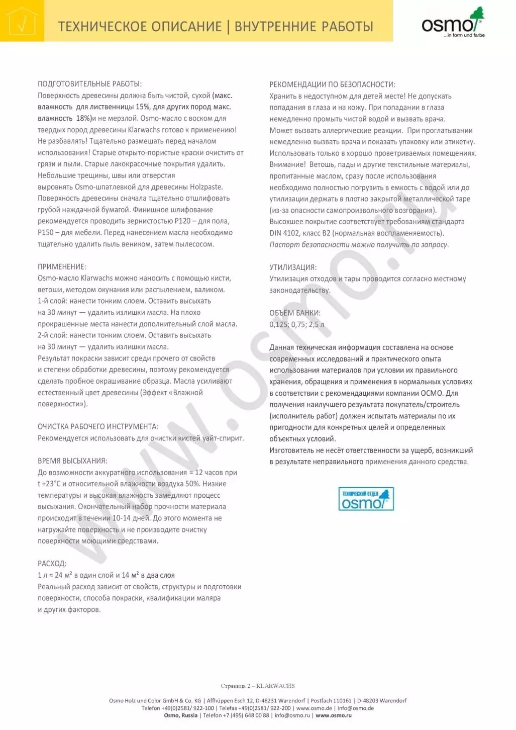 Поверхность древесины должна быть чистой, сухой (макс. влажность для лиственницы 15%, для других пород макс. влажность 18%)и не мерзлой. Osmo-масло с воском для твердых пород древесины Klarwachs готово к применению! Не разбавлять! Тщательно размешать перед началом использования! Старые открыто-пористые краски очистить от грязи и пыли. Старые лакокрасочные покрытия удалить.