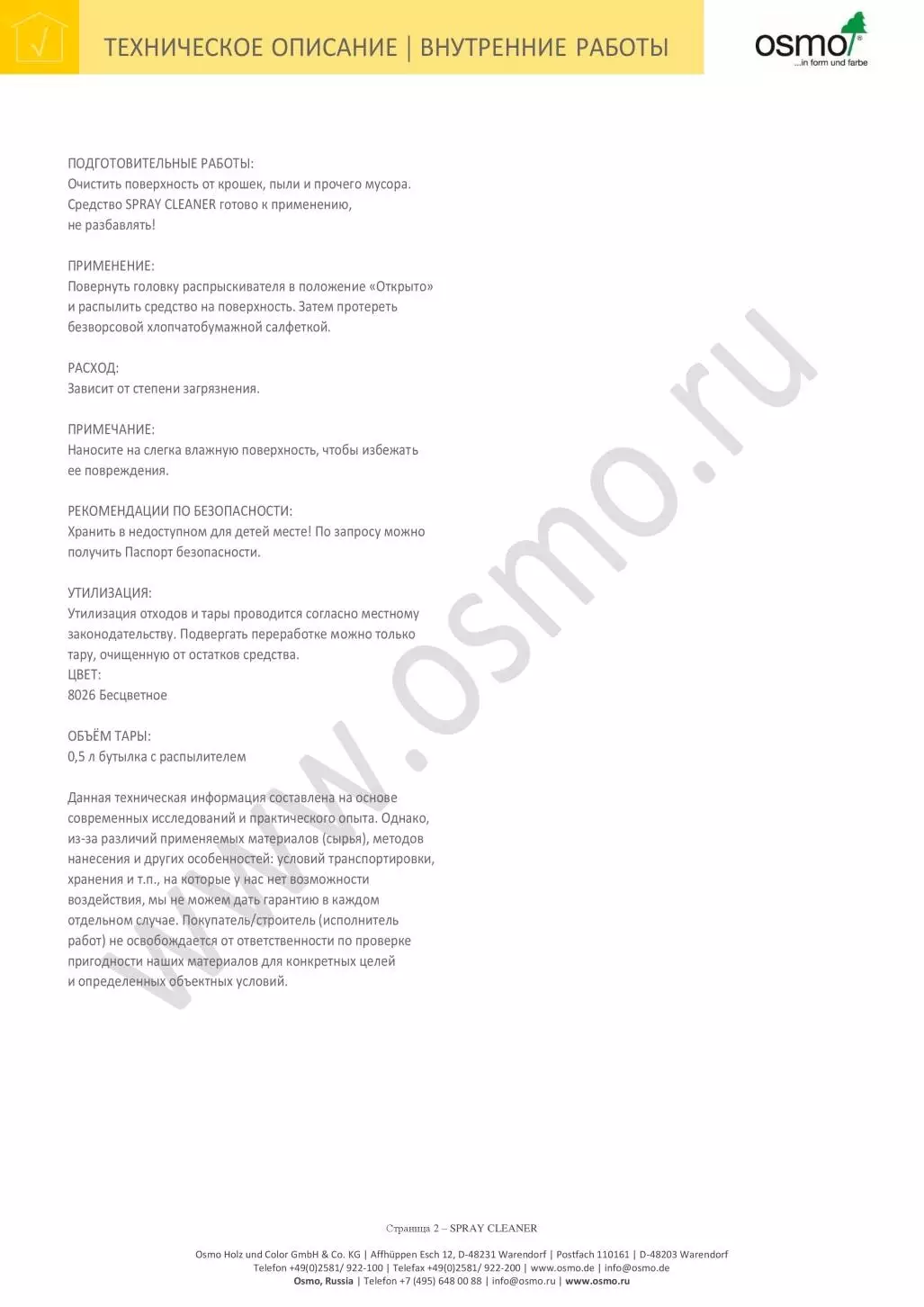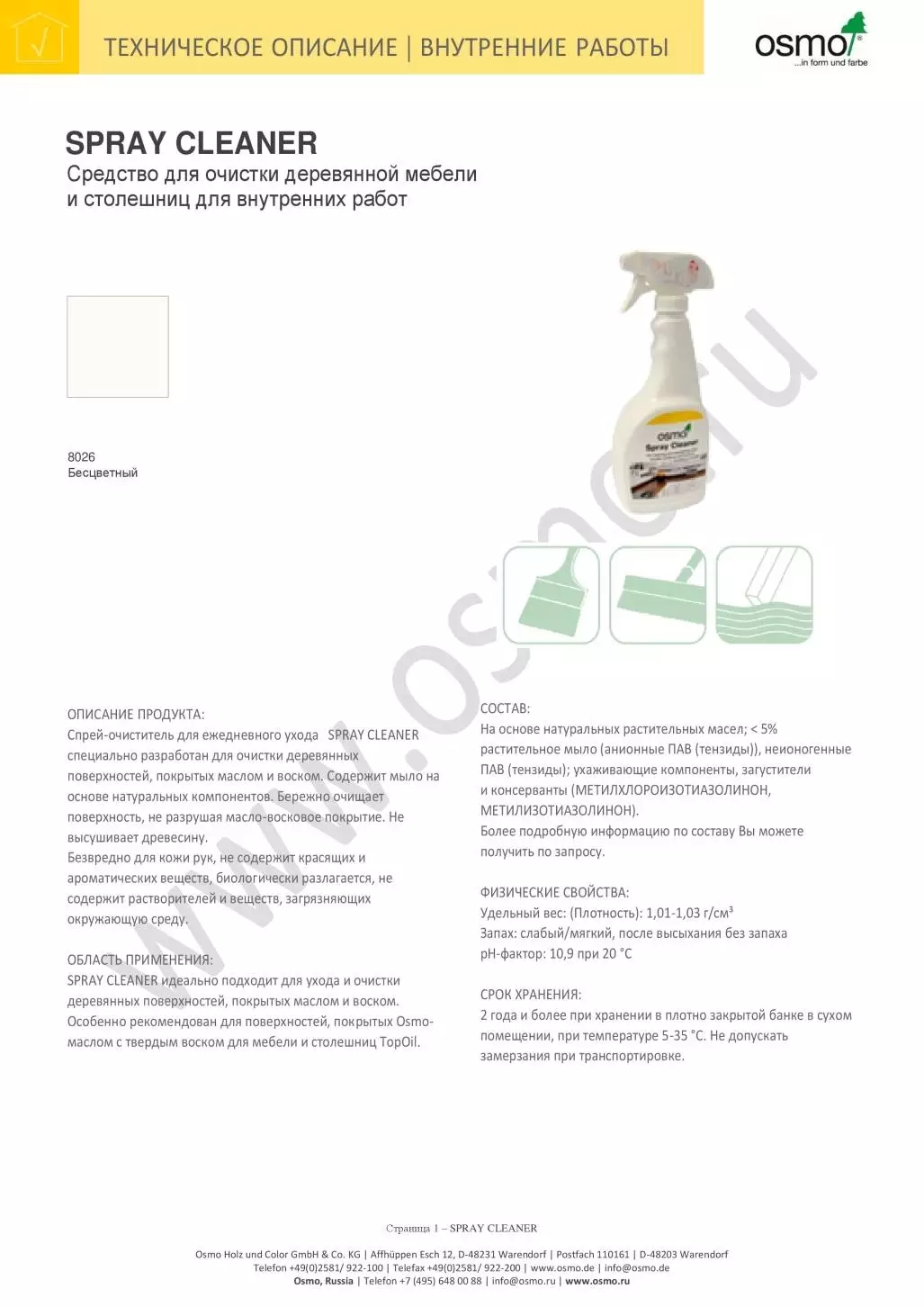 Спрей-очиститель для ежедневного ухода SPRAY CLEANER специально разработан для очистки деревянных поверхностей, покрытых маслом и воском. Содержит мыло на основе натуральных компонентов. Бережно очищает поверхность, не разрушая масло-восковое покрытие. Не высушивает древесину.
