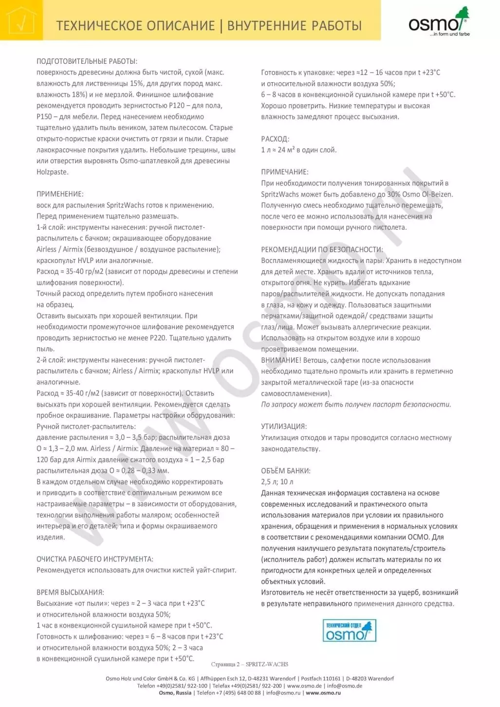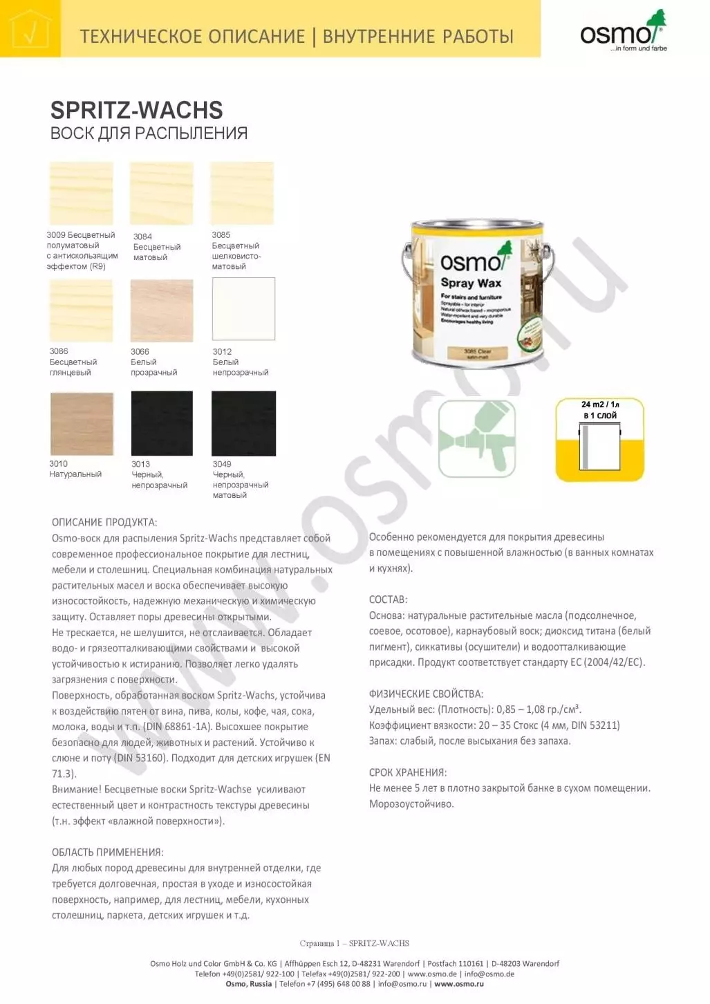 Osmo-воск для распыления Spritz-Wachs представляет собой современное профессиональное покрытие для лестниц, мебели и столешниц. Специальная комбинация натуральных растительных масел и воска обеспечивает высокую износостойкость, надежную механическую и химическую защиту. Оставляет поры древесины открытыми.