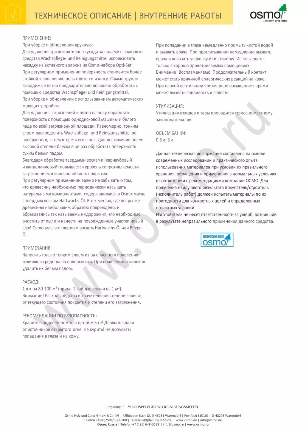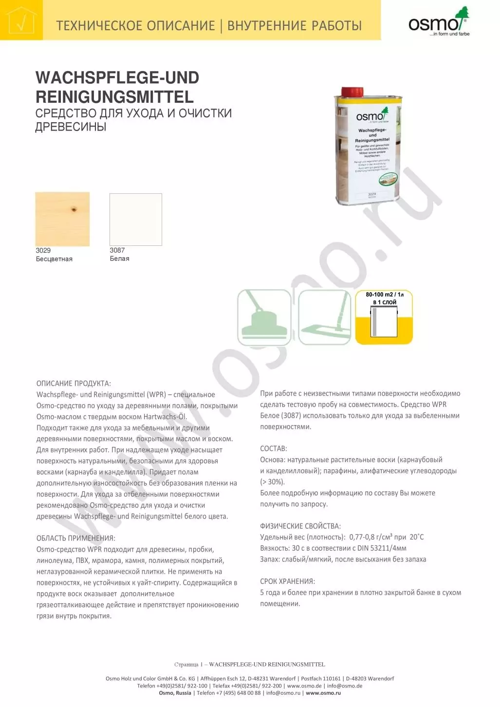 Подходит также для ухода за мебельными и другими деревянными поверхностями, покрытыми маслом и воском. Для внутренних работ. При надлежащем уходе насыщает поверхность натуральными, безопасными для здоровья восками (карнауба и канделилла). Придает полам дополнительную износостойкость без образования пленки на поверхности. Для ухода за отбеленными поверхностями рекомендовано Osmo-средство для ухода и очистки древесины Wachspflege- und Reinigungsmittel белого цвета.