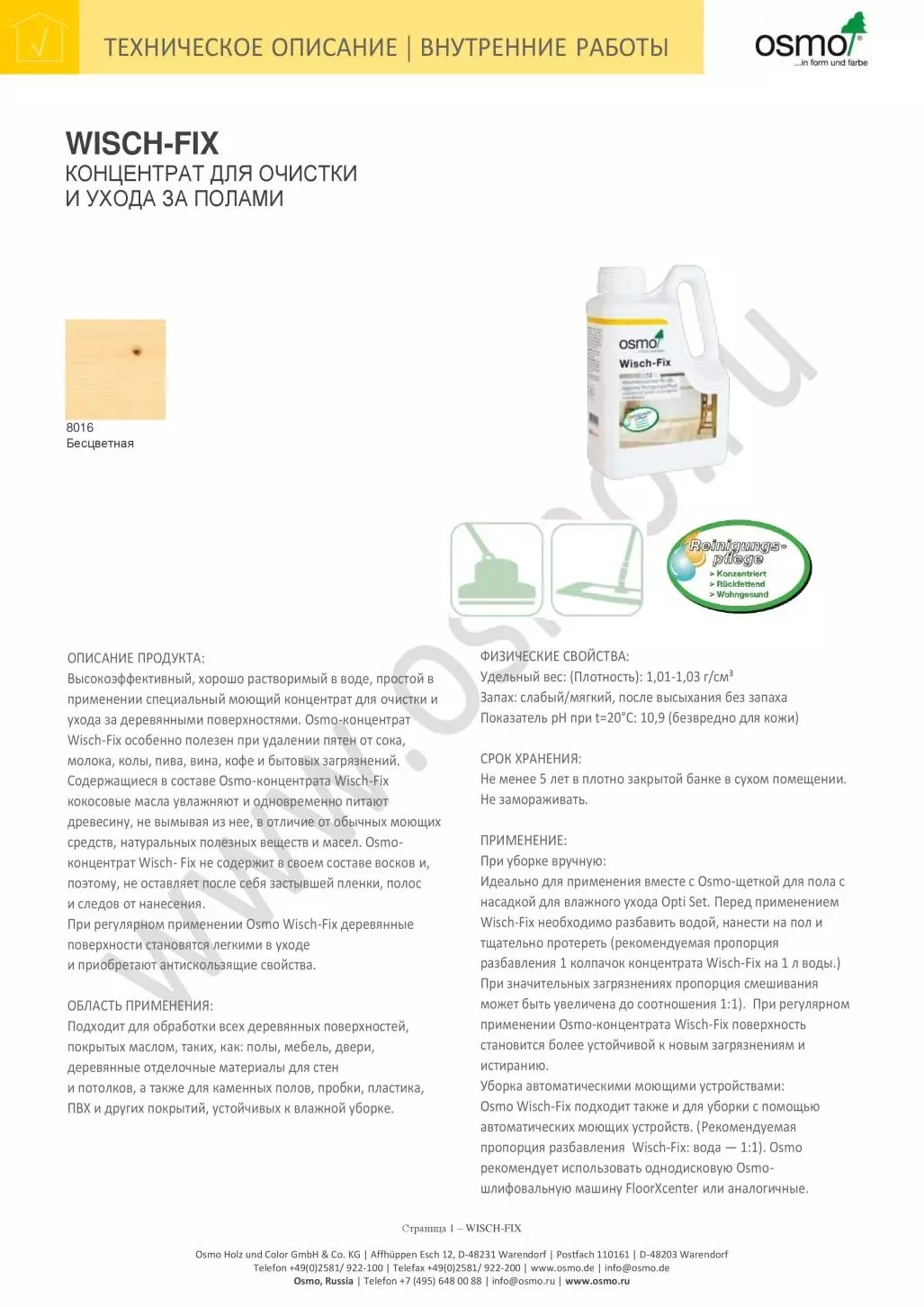 Содержащиеся в составе Osmo-концентрата Wisch-Fix кокосовые масла увлажняют и одновременно питают древесину, не вымывая из нее, в отличие от обычных моющих средств, натуральных полезных веществ и масел. Osmo- концентрат Wisch- Fix не содержит в своем составе восков и, поэтому, не оставляет после себя застывшей пленки, полос и следов от нанесения.