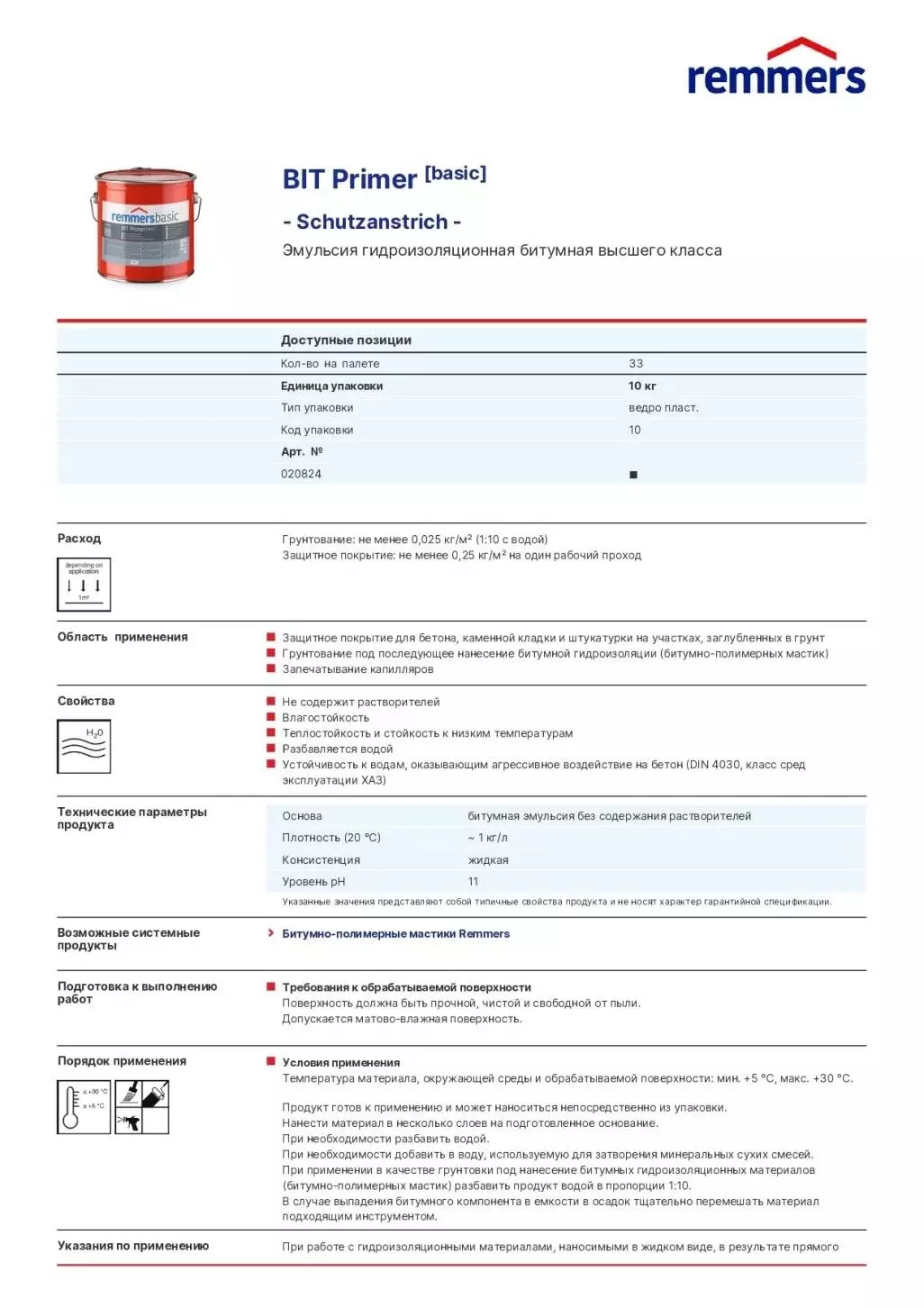 Remmers Bit Primer/ Schutzanstrich Эмульсия гидроизоляционная битумная высшего класса