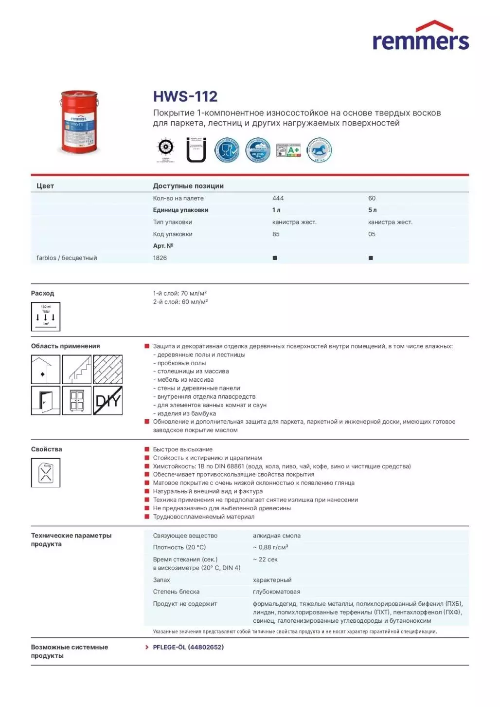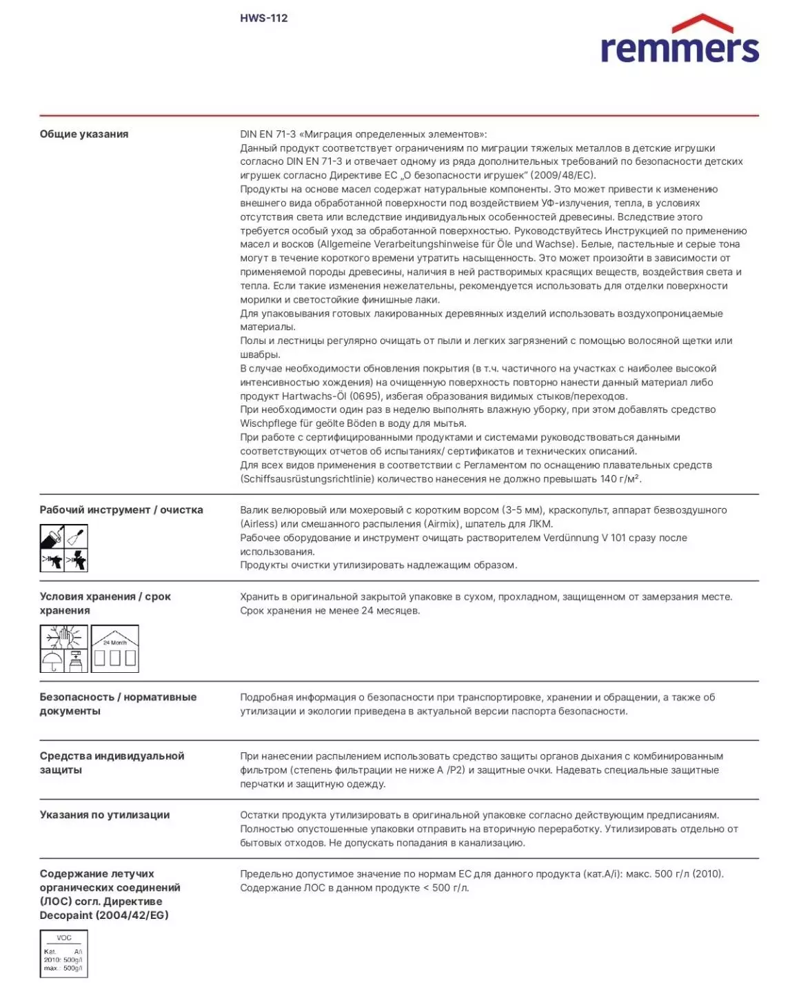 - Продукт не содержит - формальдегид, тяжелые металлы, полихлорированный бифенил (ПХБ), линдан, полихлорированные терфенилы (ПХТ), пентахлорфенол (ПХФ), свинец, галогенизированные углеводороды и бутаноноксим.