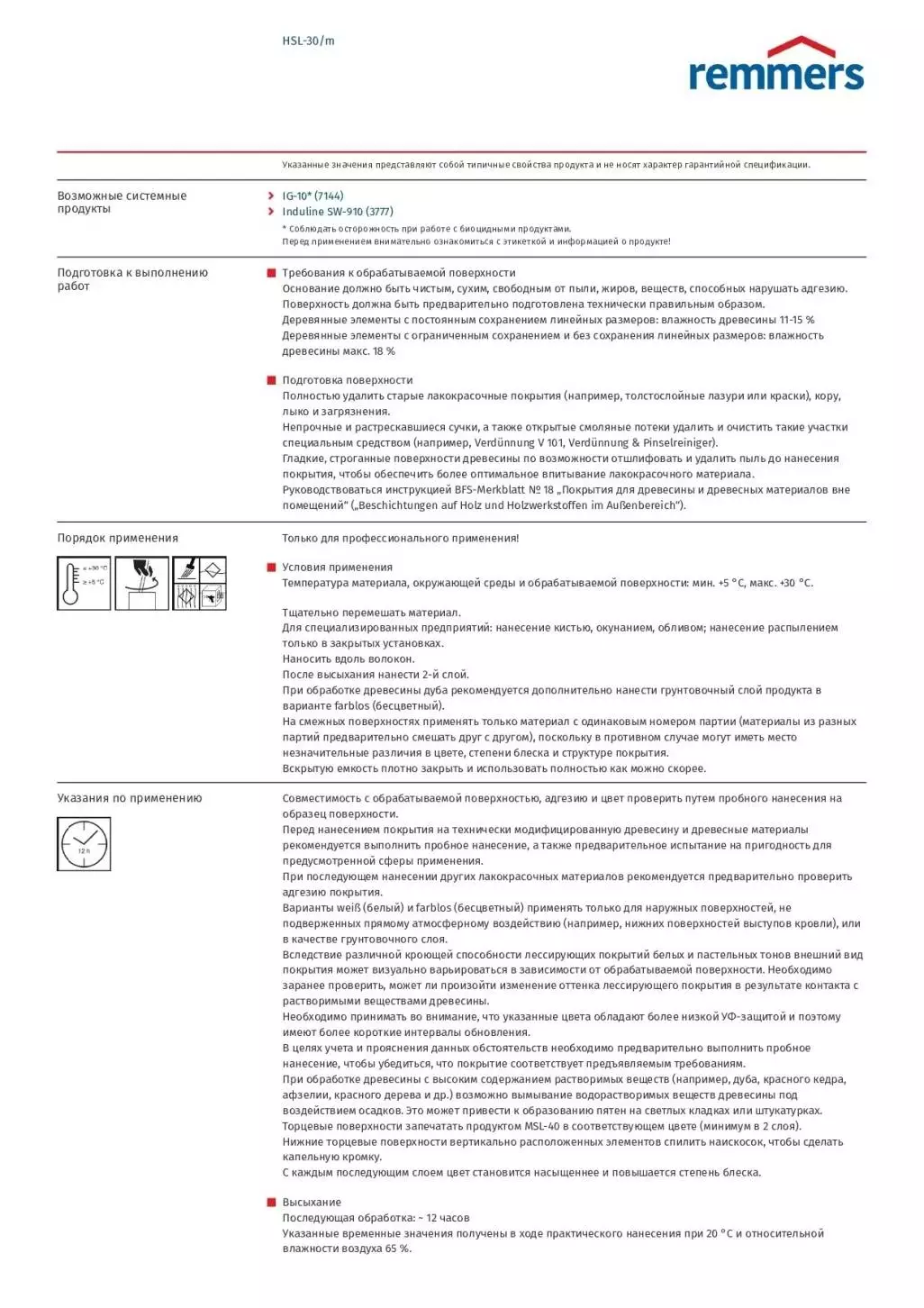 Основание должно быть чистым, сухим, свободным от пыли, жиров, веществ, способных нарушать адгезию. Поверхность должна быть предварительно подготовлена технически правильным образом. Деревянные элементы с постоянным сохранением линейных размеров: влажность древесины 11-15 % Деревянные элементы с ограниченным сохранением и без сохранения линейных размеров: влажность древесины макс. 18 %