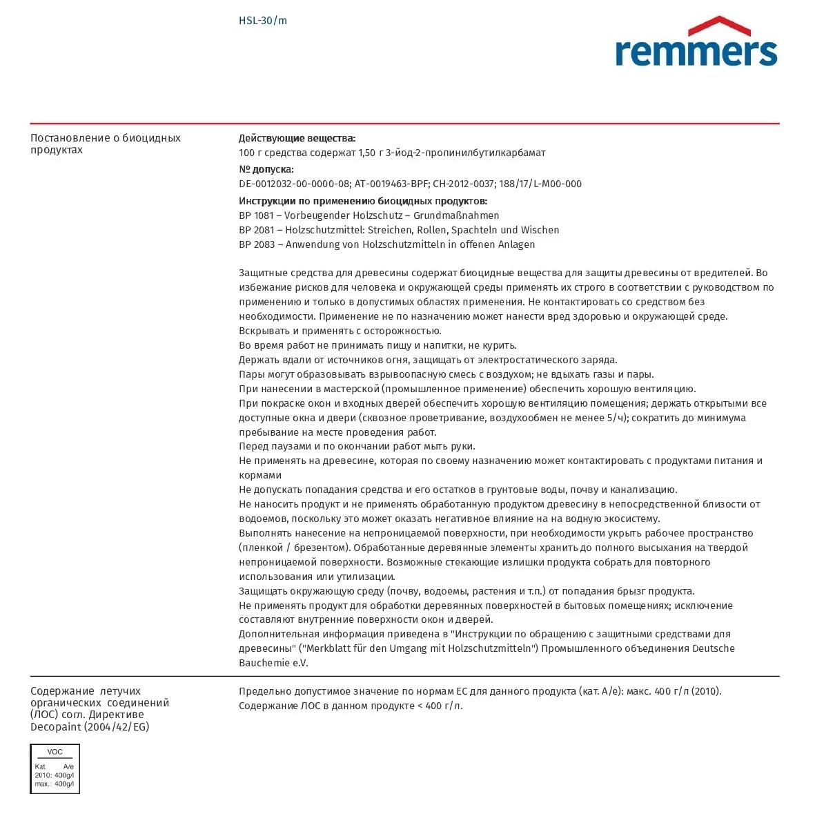 Remmes HSL-30/M-ProfiI Farblos Лазурь 3в1 пропитывающая на основе растворителя для защиты и декоративной отделки фасадов из древесины