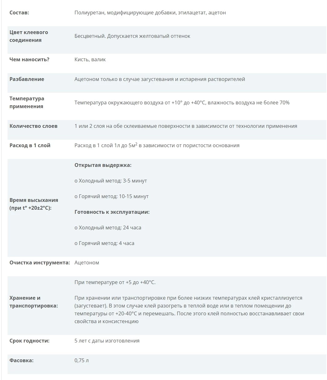 в герметично закрытой таре при температуре от +5 до +40°С при температуре ниже +5°С клей "кристаллизуется" (т.е. становится более вязким) в этом случае его следует разогреть в теплой воде или в теплом помещении до температуры от +10 до +40°С и перемешать, после этого клей полностью восстанавливает свои свойства и консистенцию. |
