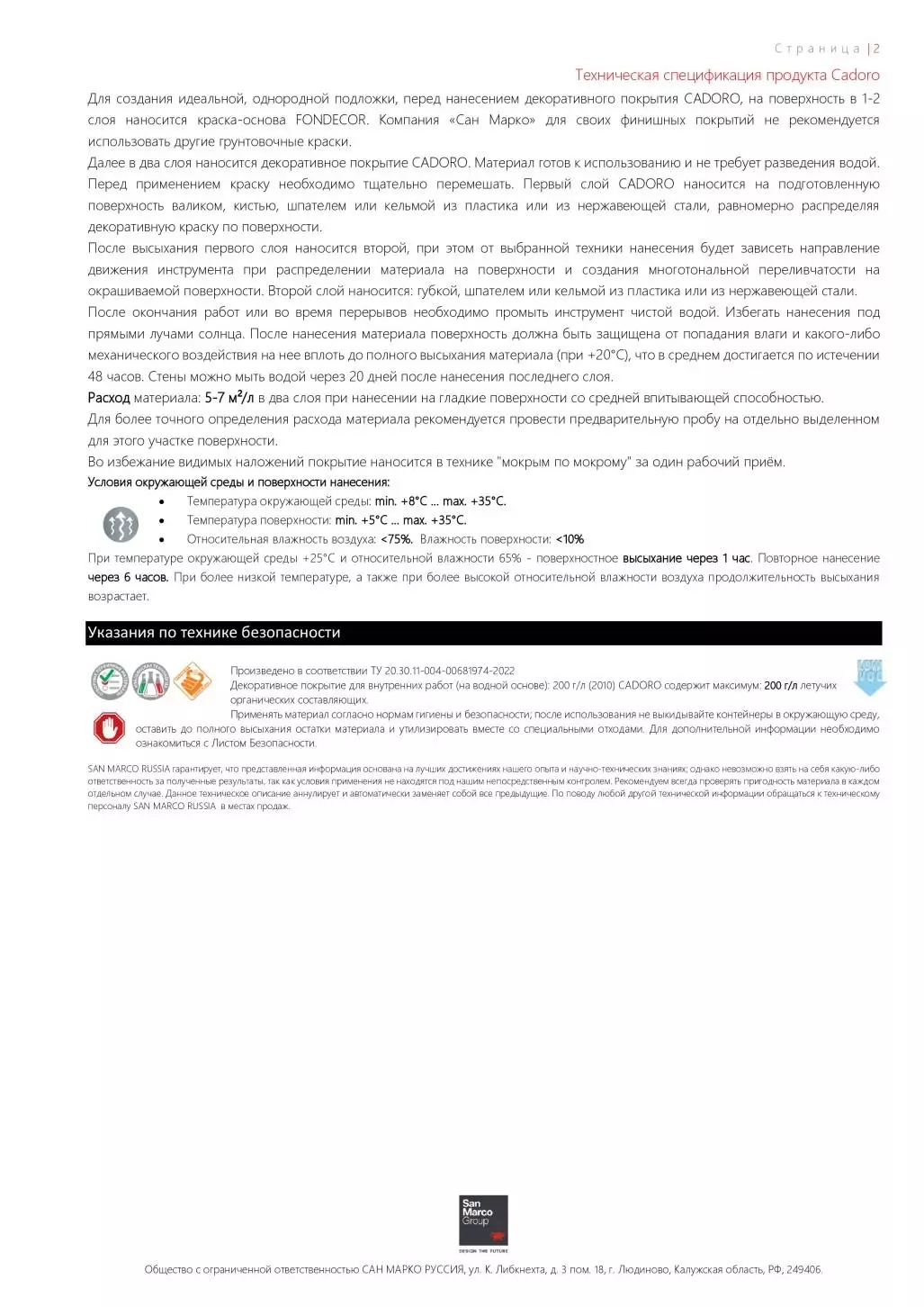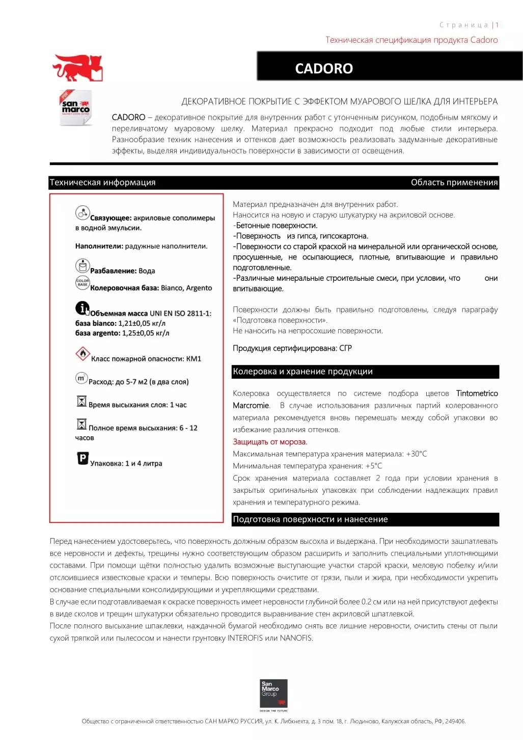 Для создания идеальной, однородной подложки, перед нанесением декоративного покрытия CADORO, на поверхность в 1-2 слоя наносится краска-основа FONDECOR. Компания «Сан Марко» для своих финишных покрытий не рекомендуется использовать другие грунтовочные краски. Далее в два слоя наносится декоративное покрытие CADORО. Материал готов к использованию и не требует разведения водой. Перед применением краску необходимо тщательно перемешать. Первый слой CADORO наносится на подготовленную поверхность валиком, кистью, шпателем или кельмой из пластика или из нержавеющей стали, равномерно распределяя декоративную краску по поверхности. После высыхания первого слоя наносится второй, при этом от выбранной техники нанесения будет зависеть направление движения инструмента при распределении материала на поверхности и создания многотональной переливчатости на окрашиваемой поверхности. Второй слой наносится: губкой, шпателем или кельмой из пластика или из нержавеющей стали. После окончания работ или во время перерывов необходимо промыть инструмент чистой водой. Избегать нанесения под прямыми лучами солнца. После нанесения материала поверхность должна быть защищена от попадания влаги и какого-либо механического воздействия на нее вплоть до полного высыхания материала (при +20°C), что в среднем достигается по истечении 48 часов. Стены можно мыть водой через 20 дней после нанесения последнего слоя.