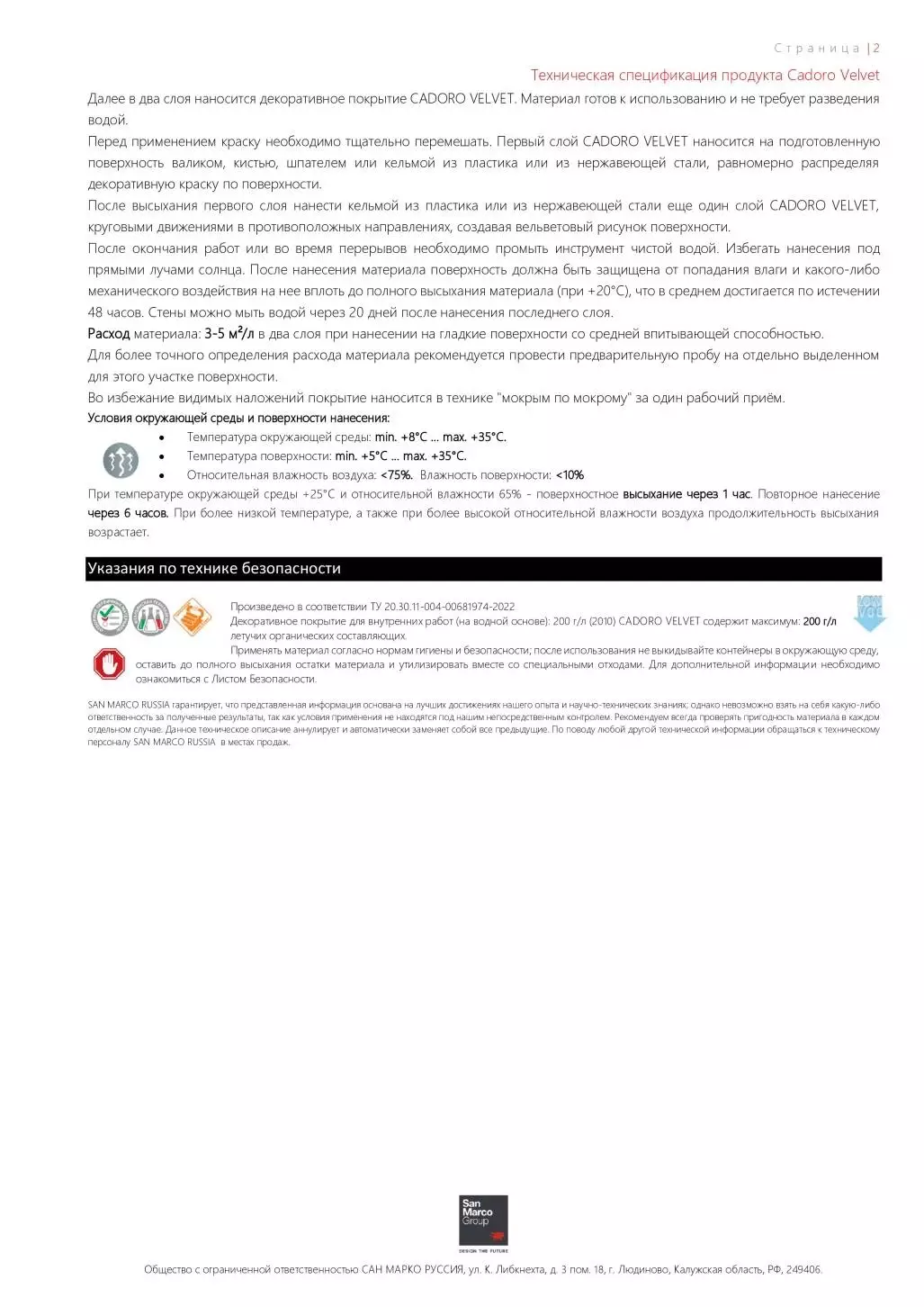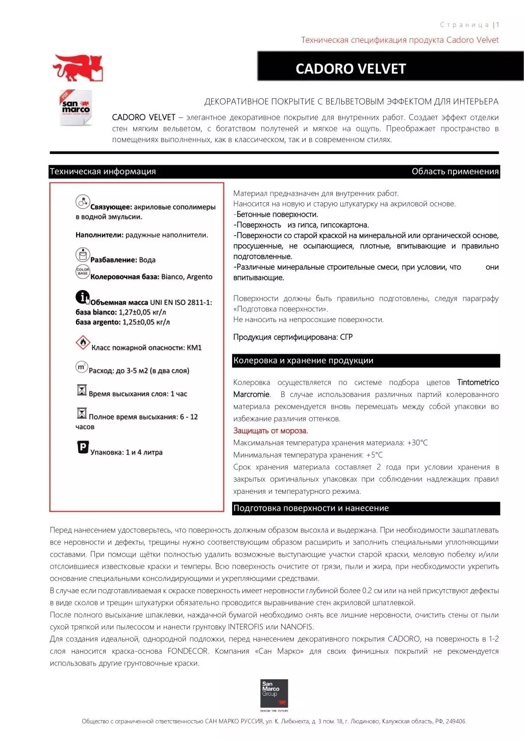 Декоративное покрытие Cadoro Velvet от европейского бренда San Marco, наполнит ваш дом теплом и нежностью. Красивый рисунок, который можно создать простым движение руки с помощью кельмы, будет радовать Вас долгие годы. Самое востребованная альтернатива поклейке устаревших обоев, которые накапливают пыль, отклеиваются и довольно быстро приходят в негодность. С декоративным покрытием Cadoro Velvet вы забудете о этих разочарованиях. Покрытие имеет прочное основание после полного высыхания, за ним легко ухаживать и очищать от пыли, кроме того материл полностью безопасен для человека. Состав разработан на водной основе с добавлением акриловых сополимеров для получения специального вельветового эффекта.